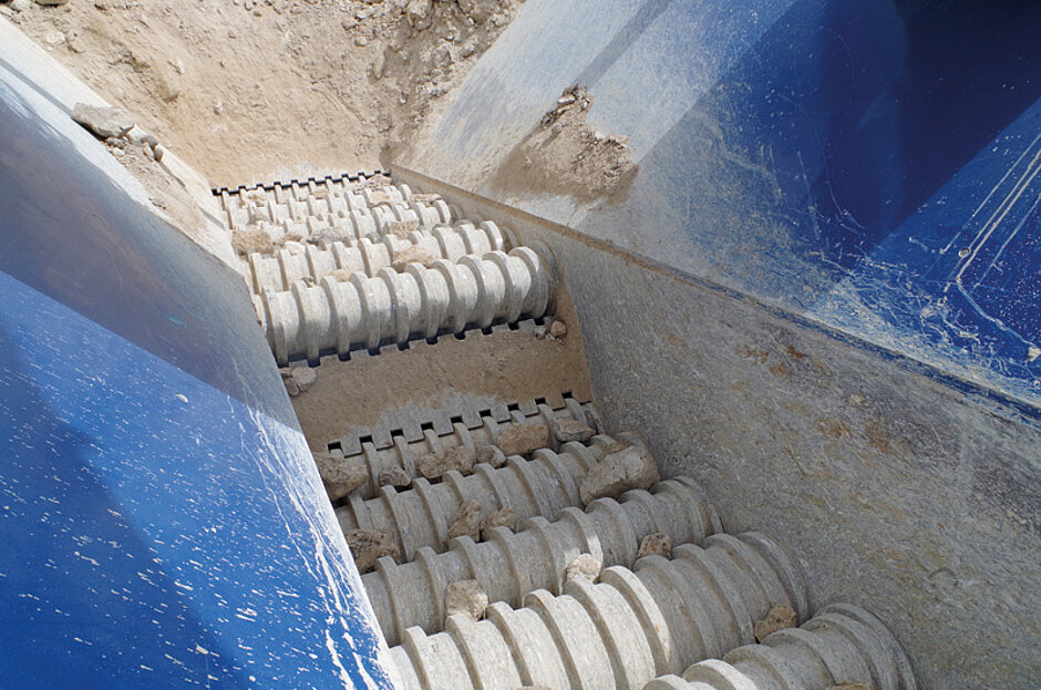 Seit Juli 2016 setzt SMBP die 160 t schwere MC 125 RR in der ersten Brechstufe ein. Der Kalkstein wird mit einer Größe von 0 – 900 mm auf die elliptischen Rollen in der ersten Stufe des Rollenrosts gegeben. Dabei werden Schmutz und Staub von den Steinen entfernt. Das Material wird nivelliert und anschließend auf die zweite Stufe des Rollenrosts befördert für eine weitere Reinigung und bessere Materialverteilung. Das Feinmaterial von 0 – 80 mm fällt durch die Rollen auf ein Förderband und verlässt über das Seitenaustragsband den Prozess. So wird der Verschleiß am Backenbrecher reduziert und eine Gesamtleistung von 600 t/h erreicht. Das Überkorn wird auf 0 – 300 mm gebrochen und im Anschluss von einer stationären Anlage für die Betonherstellung weiter aufbereitet.