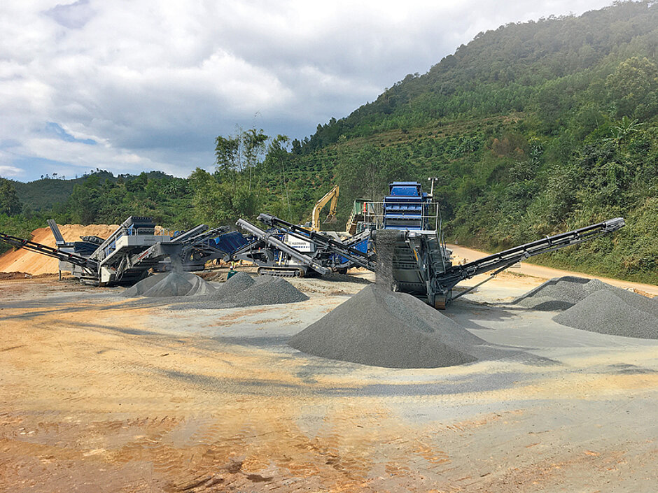 Im starken Geschäftsfeld Tiefbau führt Licogi 16 verschiedene Straßen- und Brückenbau-Aufträge aus und unterhält eine enge Geschäftsbeziehung mit dem vietnamesischen Wirtgen-Group-Händler Vitrac. Dank der guten Erfahrungen mit Technologien anderer Produktmarken entschied sich das Unternehmen für einen raupenmobilen Anlagenzug von Kleemann. In dieser Formation geben die blauen Brech- und Siebanlagen ihre Vietnam-Premiere, die in der gesamten Region und auch darüber hinaus intensiv beobachtet wird. Der Anlagenzug besteht aus fünf Einheiten: In der Reihenfolge ihrer Verkettung sind dies ein Backenbrecher MC 110 Z Evo, ein Kegelbrecher MCO 9 Evo, eine Siebanlage MS 703 Evo, ein Kegelbrecher MCO 9 S Evo und eine Siebanlage MS 19 D.