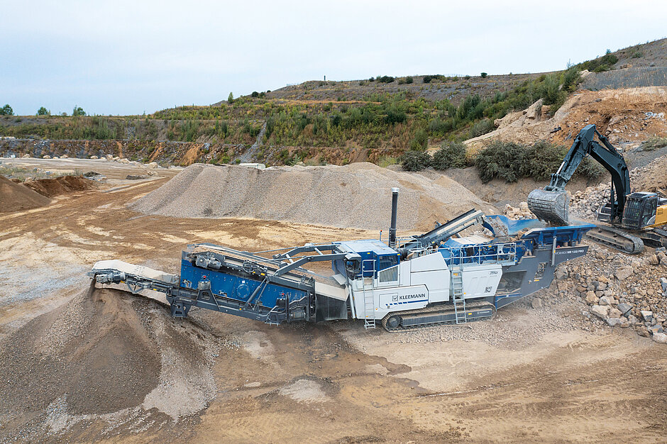 Mit dem Kleemann Prallbrecher Mobirex MR 130i Pro wird im Steinbruch Oetelshofen Kalkstein für die Brennindustrie gebrochen. Der Wunsch des Betreibers Amiro GmbH war, im Gegensatz zu früher, als ein Prallbrecher und eine getrennte Siebanlage zum Einsatz kamen, nun eine Kombianlage, bei der die Siebeinheit direkt an die Brechanlage angeschlossen ist. Deswegen arbeitet dort jetzt die Mobirex MR 130i Pro mit integrierter Nachsiebeinheit und Überkornrückführung. Der erste positive Effekt: ein reduzierter Kraftstoffverbrauch, da jetzt nur noch eine Maschine betankt werden muss, die zudem auch noch geringe Verbrauchswerte aufzeigt.
