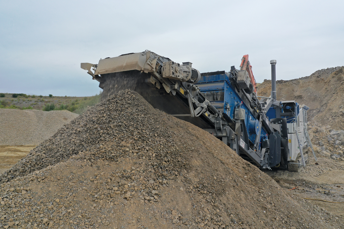 Mit der neuen Maschine wird mit der Aufgabegröße 0/600 das Endprodukt 0/45 erzielt. Über die Doppeldecker-Nachsiebeinheit wird eine Endkörnung ausgetragen, wobei beide Siebdecks voll genutzt werden. Im Unterdeck ist hierfür eine 50er-Quadratmasche verbaut, das Oberdeck ist mit einer größeren Masche als Entlastungsdeck installiert. So wird sowohl das Überkorn des Oberdecks als auch des Unterdecks unkompliziert via reversierbarem Transferband auf das Überkornband geleitet und dem Brechprozess wieder zugeführt.