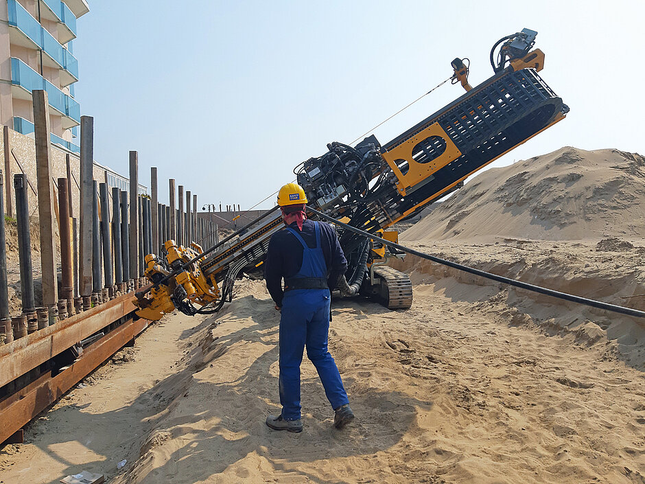 Am Strand von Jesolo soll durch das Bauunternehmen Rodighiero Claudio & C. S.r.l. ein fünfstöckiges Wohngebäude errichtet werden. »In der Regel stellt der Kunde Anker nicht selbst her«, erklärt Andrea Ruggero, Sales Area Manager von Bauer Macchine Italia, »aber diesmal hat er beschlossen, die Arbeiten selbst auszuführen und sich im Rahmen eines Komplettpakets auf die Erfahrung und Unterstützung von Bauer Macchine Italia zu verlassen.« Hinzu fügt Roggero, dass der Plan die Ausführung von Standardfundamenten vorsah. »Dazu gehörten Aushubarbeiten und das Anlegen von normalen Fundamenten. Auf einer Seite wurde jedoch eine Fahrspur angelegt, um die Baustelle schweren Fahrzeugen zugänglich zu machen. Das erforderte eine Verstärkung des Untergrunds mithilfe von Ankern. Hierzu wurden 40 mm Ischebeck-Titan Selbstbohranker unter 45° Neigung in eine Tiefe von 10 m bis 13 m eingebracht. Diese Technik wurde gewählt, da eine hohe Ausführungsgeschwindigkeit gefordert war. In ganz Norditalien kommt diese Technik immer häufiger zum Einsatz. Die Entscheidung hat sich zeitlich bezahlt gemacht: 300 m Anker konnten in nur einer Arbeitsschicht eingebracht werden.