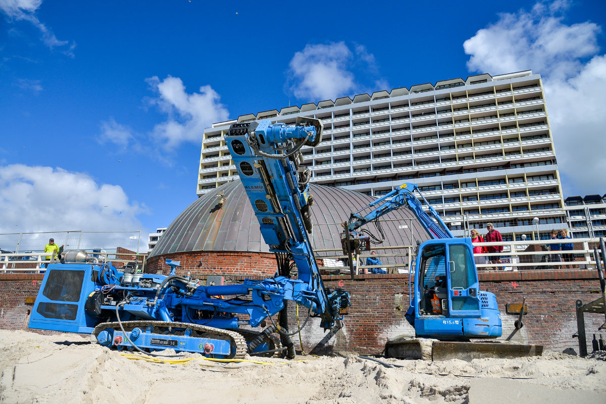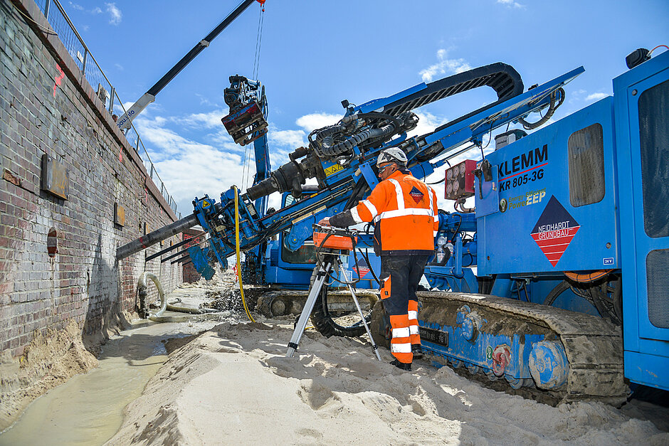 Das Hamburger Unternehmen Neidhardt Grundbau hat an zwei Teilabschnitten die Bohrarbeiten zur Herstellung der Rückverankerung ausgeführt. Bei den Überlagerungsbohrungen mit Wasserspülung setzte Neidhardt ein Klemm-Ankerbohrgerät KR 805-3G ein, mit dem insgesamt 130 GEWI-Verpresspfähle 40/50 DKS mit einer Bohrlänge von 2 188 lfm eingebracht wurden. t