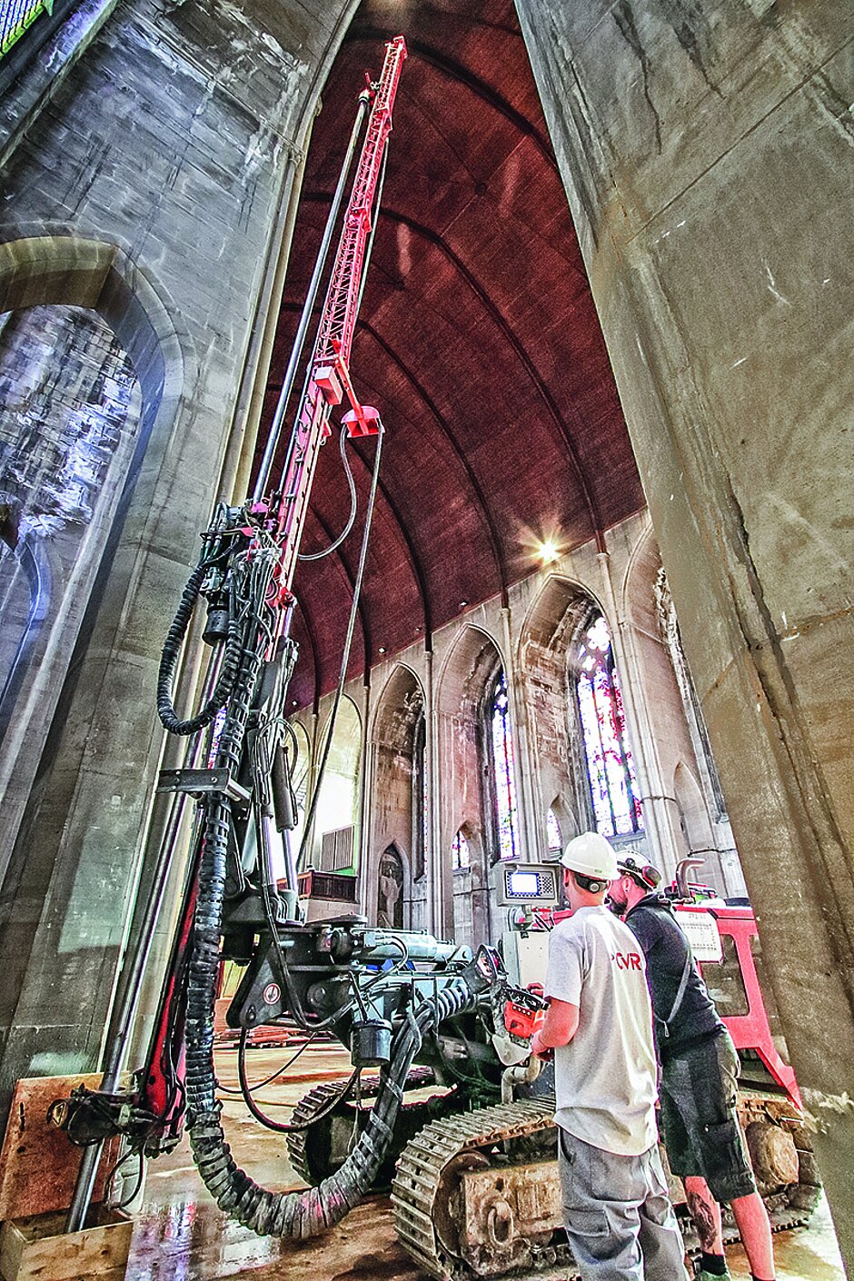 Die Arbeiten unter zum Teil sehr beengten Platzverhältnissen, beispielsweise entlang der bestehenden Kirchenfundamente, erforderten ein Bohrgerät mit kompakten Abmessungen. Mit seinem flexiblen und tragfähigen Vorbau zur Ausrichtung der Bohrlafette in verschiedenste Bohrneigungen und Abstände vor und seitlich des Bohrgeräts stellte das KR 801-3FS hierfür eine gute Wahl dar.