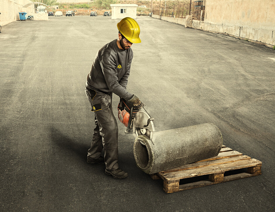 Rund 10 kg bis 11 kg beträgt das Durchschnittsgewicht eines modernen Benzintrennschleifers. »Weil das Gewicht ausschließlich auf den Armen lastet, ist die Arbeit mit dem Werkzeug besonders anstrengend«, weiß Ibraim Lapa, Leiter Business Development bei Klingspor. »Dieser Umstand hat uns zu der Frage geführt, wie man den Anwender dabei entlasten kann. Aktuell lässt es sich nur dadurch komfortabler gestalten, wenn die Schnitte so schnell wie möglich erfolgen und der Anwender das Werkzeug kürzere Zeit halten muss.« Den wichtigsten Vorteil für den Anwender verspricht das verarbeitete sogenannte Turbosegment. »Die darin enthaltenen Verzahnungen reduzieren die Reibung – und ermöglichen dadurch schnellere Schnitte«, erklärt Lapa. Eigenschaften, die vor allem bei der Verarbeitung von Stahlbeton wichtig sind. »Dieser kommt in der Bauindustrie in verschiedensten Zug- und Druckfestigkeitsklassen zum Einsatz. Deshalb haben wir bei der Entwicklung darauf geachtet, dass die Scheibe sich gleichermaßen für alle gängigen Standardklassen eignet«, so Lapa.