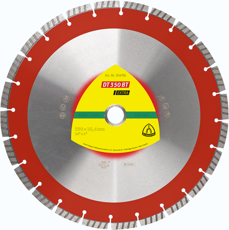 Seit diesem Jahr hat Klingspor mit der DT 350 BT eine besonders aggressive Diamanttrennscheibe im Angebot, die speziell auf die Bedürfnisse der Bauindustrie zugeschnitten ist. »Wie alle unsere Diamanttrennscheiben wird auch bei der DT 350 BT jedes Segment einzeln überprüft – schließlich müssen die Scheiben bei uns nicht nur die gesetzlichen Mindestanforderungen erfüllen, sondern auch den hohen Anforderungen der ›Organization for the Safety of Abrasives‹ genügen«, unterstreicht Ibraim Lapa. t
