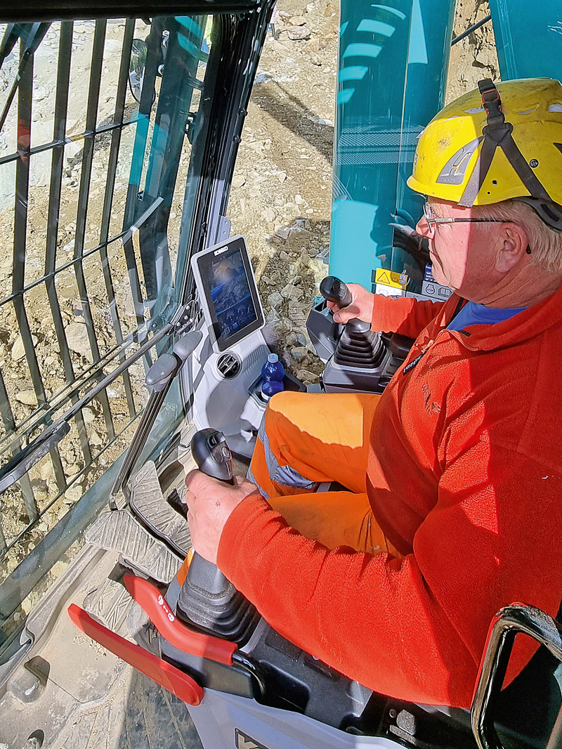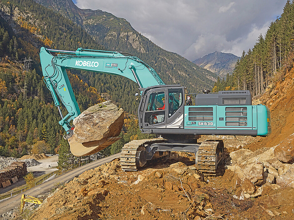 Nach den ersten Betriebswochen zeigt sich auch Steinbruchleiter Elias Tresch mit dem Kobelco SK530LC-11 vollauf zufrieden. Vor allem in den Disziplinen Hubkraft, Standfestigkeit und Steigfähigkeit punktet die Maschine und erfüllt auch in einem anderen Aspekt alle Erwartungen: Trotz regelmäßiger Einsätze im obersten Leistungsbereich bleibt der Verbrauch unter 40 l/h und pendelt im Schnitt zwischen 33 l/h und 36 l/h. t