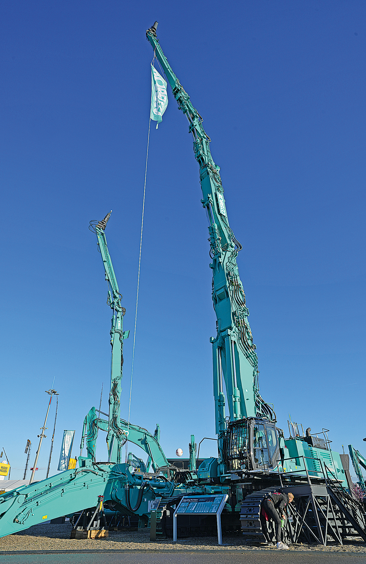 Unter den neuen Modellen, flankiert von Anbaugeräten verschiedener Hersteller, stach insbesondere das neue Flaggschiff SK1300DLC hervor und damit der derzeit größte Abbruchbagger aus OEM-Produktion (das bauMAGAZIN berichtete in Heft 9/22, Seite 49). Für das kommende Jahr, so Makoto Kato, erwarte Kobelco weiteres Wachstum im Rückbausektor. In Japan gilt der Hersteller seit Langem als Marktführer in diesem Segment, was viele hierzulande nicht wissen. Aufgrund der zahlreichen Erdbeben werden Gebäude oft massiv mit Beton oder Stahl verstärkt, um den seismischen Aktivitäten standhalten zu können. Das bringt letztlich aber eine größere Herausforderung bei Abbrucharbeiten mit sich.