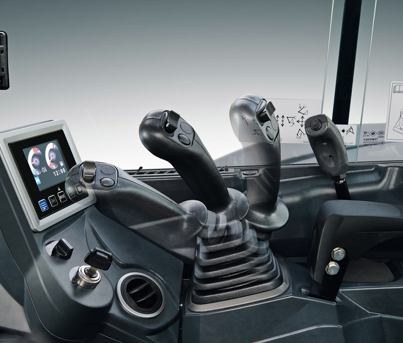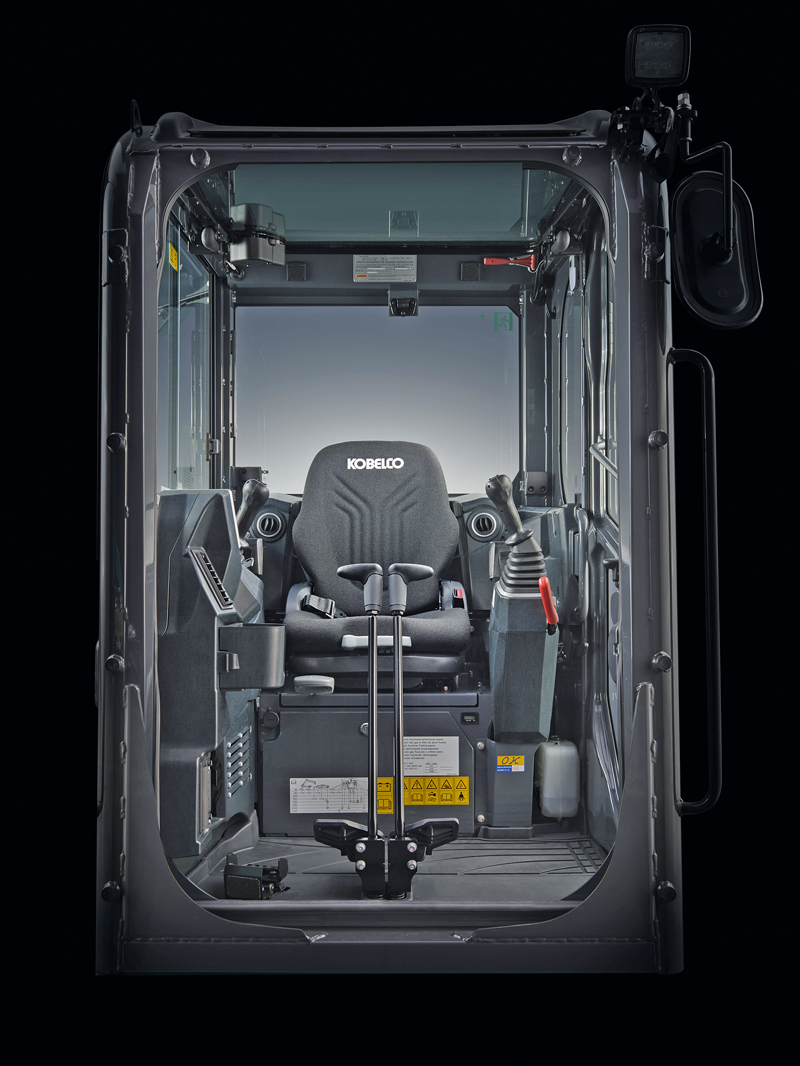 Für sicheres Arbeiten erfüllen die Kabine bzw. das optionale Schutzdach die Standards ROPS, TOPS und OPG-Stufe 1 (Dachgitter). Der serienmäßige LED-Arbeitsscheinwerfer ist zum Schutz vor Beschädigungen unter dem Ausleger angebracht. Die Wischerhalterung wurde nach rechts oben am Kabinenholm verlegt und die Dachfensteröffnung vergrößert, um die Sicht des Fahrers auf die Baustelle weiter zu verbessern. Das Fenster auf der rechten Seite der Kabine lässt sich zur Belüftung und zur besseren Wahrnehmung von Außengeräuschen jetzt nach vorne und nach hinten öffnen. Ebenso wurde die Türverriegelung angepasst und die Tür öffnet weit für einen besseren Zugang.