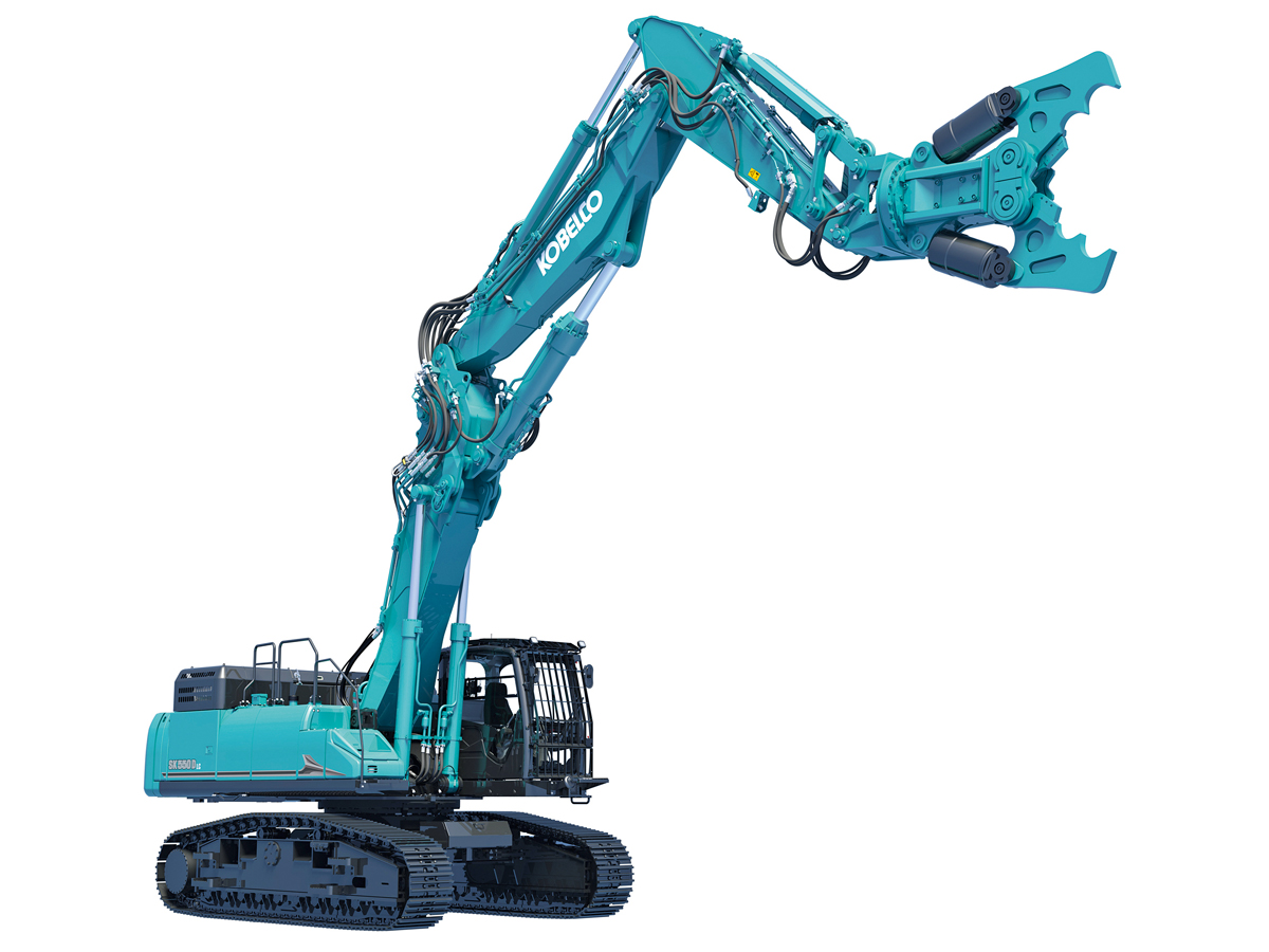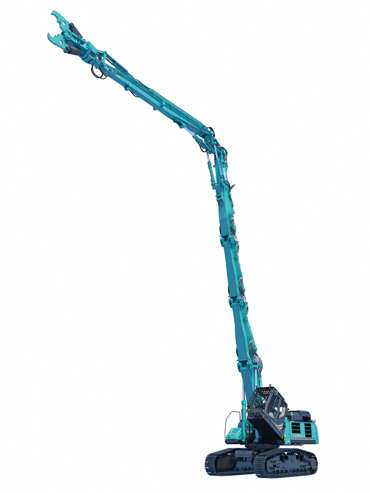 Ein kurzer zweiteiliger Ausleger in schwerer Ausführung ermöglicht mit entsprechend leistungsfähigen Anbauwerkzeugen und großen Reißkräften laut Kobelco effiziente Angriffe in gut 15 m Höhe und Arbeitstiefen von knapp über 7 m (Bolzenhöhe/-tiefe: 14,62 m/– 6,26 m). Der Wechsel der spezifisch verstärkten Arbeitsausrüstungen erfolgt schnell und einfach vor Ort – serienmäßig sind die Next-Ausleger bereits für die Ausrüstung mit Schnellwechslern vorbereitet.