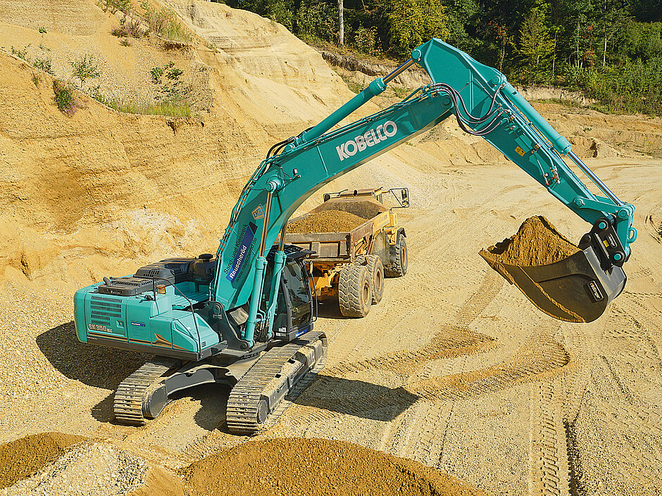 Im Sommer 2022 übernahm das Sand- und Kieswerk Rauscheröd den neuen Kobelco SK350NLC-11 als aktuell größten Bagger im Fuhrpark. Neben dem bereits 2020 gelieferten 32-Tonner Kobelco SK300NLC wird der 213 kW starke 37-t-Bagger vorrangig im Abbau eingesetzt, wechselt aufgrund serienmäßiger Hammer- und Scherenleitungen, mechanischem Schnellwechsler und kompakter Transportabmessungen (Breite: 2 990 mm) jedoch auch kurzfristig zu anderen Aufgaben im Unternehmen.