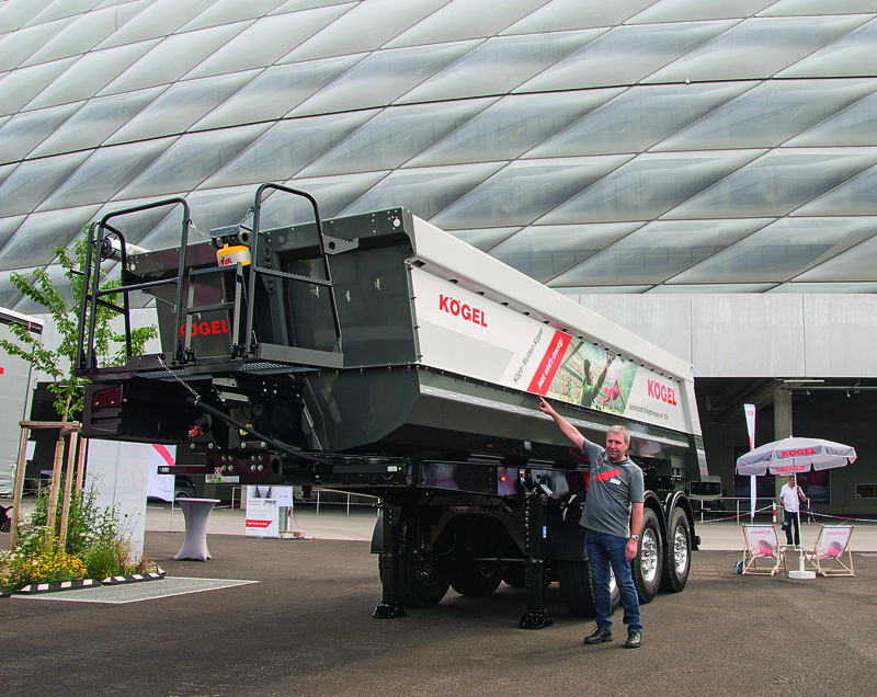 Dementsprechend euphorisch pries Josef Warmeling bei der IAA-Presse-Preview in der Münchner Allianz-Arena den neuen Kögel-Mulden-Kipper an, der »über noch mehr Nutzlast verfügt und auf der IAA das Kögel-Highlight für das Baugewerbe sein wird«. Möglich wird das durch eine Baukastenausweitung um Seiten- und Rückwände aus Aluminium. Für die 2-Achs- und 3-Achs-Mulden-Kipper mit 24 m³ Ladevolumen sind somit nicht nur unterschiedliche Wand- und Heckklappenstärken aus Stahl, sondern jetzt auch Wände und Heckklappen aus Aluminium möglich.