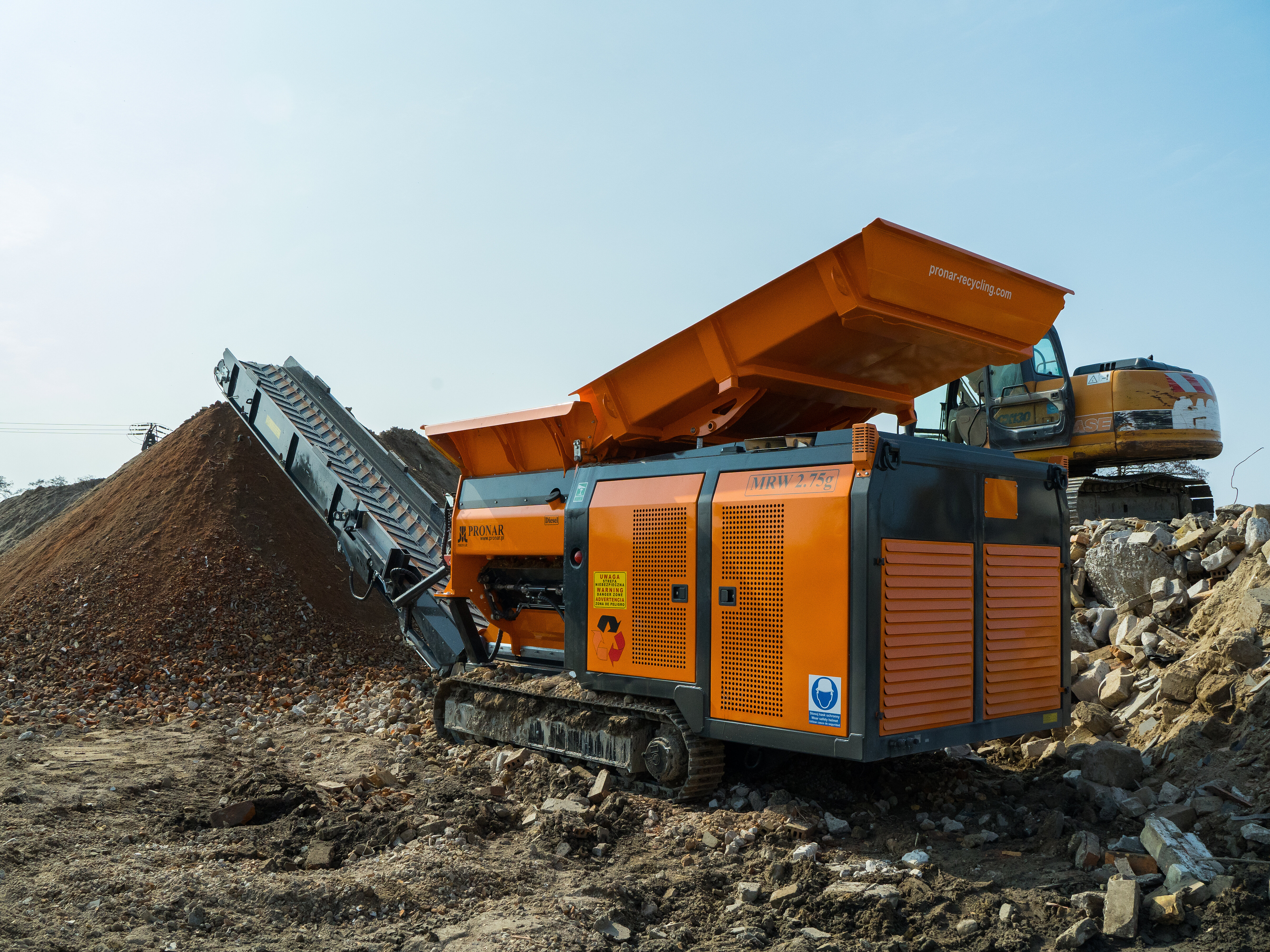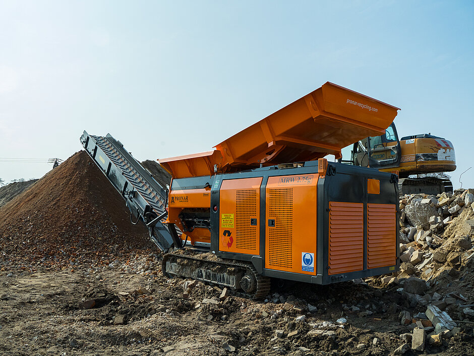 Der langsam laufende, raupenmobile Zweiwellen-Zerkleinerer MRW 2.75G könne über ausgefeilte Arbeitsprogramme optimal an unterschiedliche Aufgaben angepasst werden. Das Spektrum reicht von Hausmüll über Sperrmüll bis hin zu Abbruchmaterial wie etwa Beton. Er ist mit einem durchzugsstarken 7,7 l Volvo Penta Stufe-5-Motor mit 210 kW ausgestattet, sein Einfülltrichter fast bis zu 2,5 Kubikmeter Material. Er bringt 16,5 Tonnen auf die Waage.