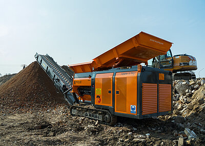 Ein gutes Beispiel für modernste Technik ist der RM100GO! von Rubble Master, ein Brecher, der auf der RecyclingAKTIV in Verbindung mit dem Maschendecksieb MS105 gezeigt wurde. Als Solomaschine bleibt er unter 30 t Gesamtgewicht. Auf der Messe wurde er mit integriertem Windsichter vorgestellt, der das Gesamtsystem zur idealen Lösung fürs Bauschuttrecycling macht. Sein Rubble Master „Go-Smart“ Service Tool ermöglicht die Einbindung mobiler Endgeräte wie Smartphones und Tablets für mehr Durchsatz und schnellstmögliche Fehlerbehebung. Die Beschickung regelt sich auf Wunsch bedarfsgerecht, indem die Zuführrinne je nach Belastung des Motors mehr oder weniger Material fördert. Aufbau in Rekordzeit: in 15 Minuten ist der Brecher einsatzbereit!