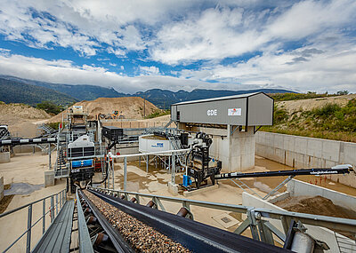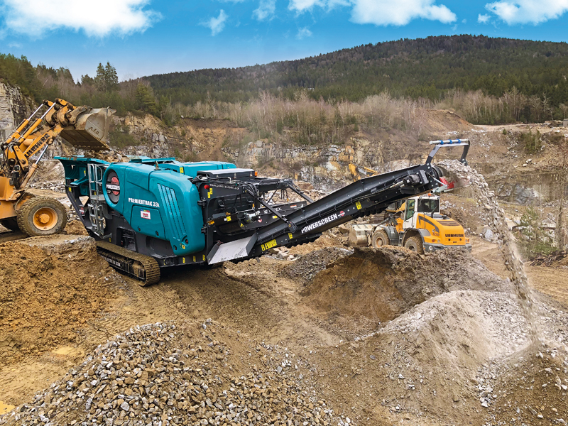 Eingang in den Premiertrak 330 findet das Aufgabematerial über einen großen, starren Trichter, komplett gefertigt aus 8-mm-Verschleißstahl. Bei einem Gesamtgewicht von 35 t erzielt der Premiertrak 330 einen Materialdurchsatz von bis zu 280 t/h. Er bewährt sich sowohl in Naturstein wie auch beim Recycling.