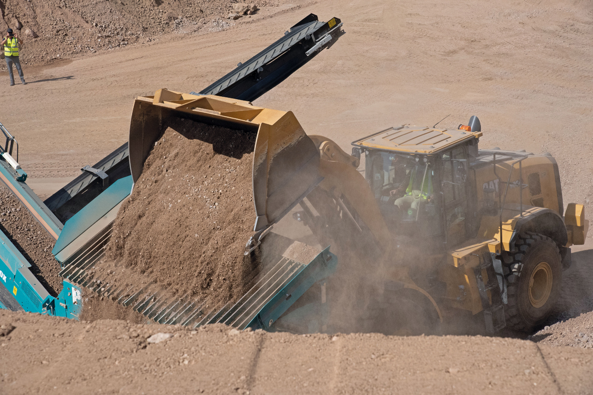 Ein Cat-Radlader beim Befüllen der Powerscreen Chieftain 1700X-2-Deck.