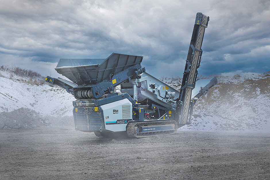 Das jüngste Kind der Rubble-Master-Produktlinie ist die mobile Siebanlage H50X, bei der einmal mehr das Verhältnis zwischen Gewicht und Durchsatz punkten will: Bei 23,9 t sollen Aufgabeleistungen von bis ca. 25 t/h möglich sein. Die Transportmaße betragen 10 950 mm x 2 550 mm x 3 200 mm (LxBxH). Die Siebmaschine wird mit 4 200 mm x 1 225 mm angegeben. Der Hybridantrieb des Siebes soll so effizient ausgelegt sein, dass eine Kraftstoffeinsparung von bis zu 25 % gegenüber einem herkömmlich angetriebenen Sieb dieser Größenklasse möglich ist. Noch effizienter arbeite das Sieb, wenn es komplett über einen angeschlossenen Hybridbrecher versorgt werde.