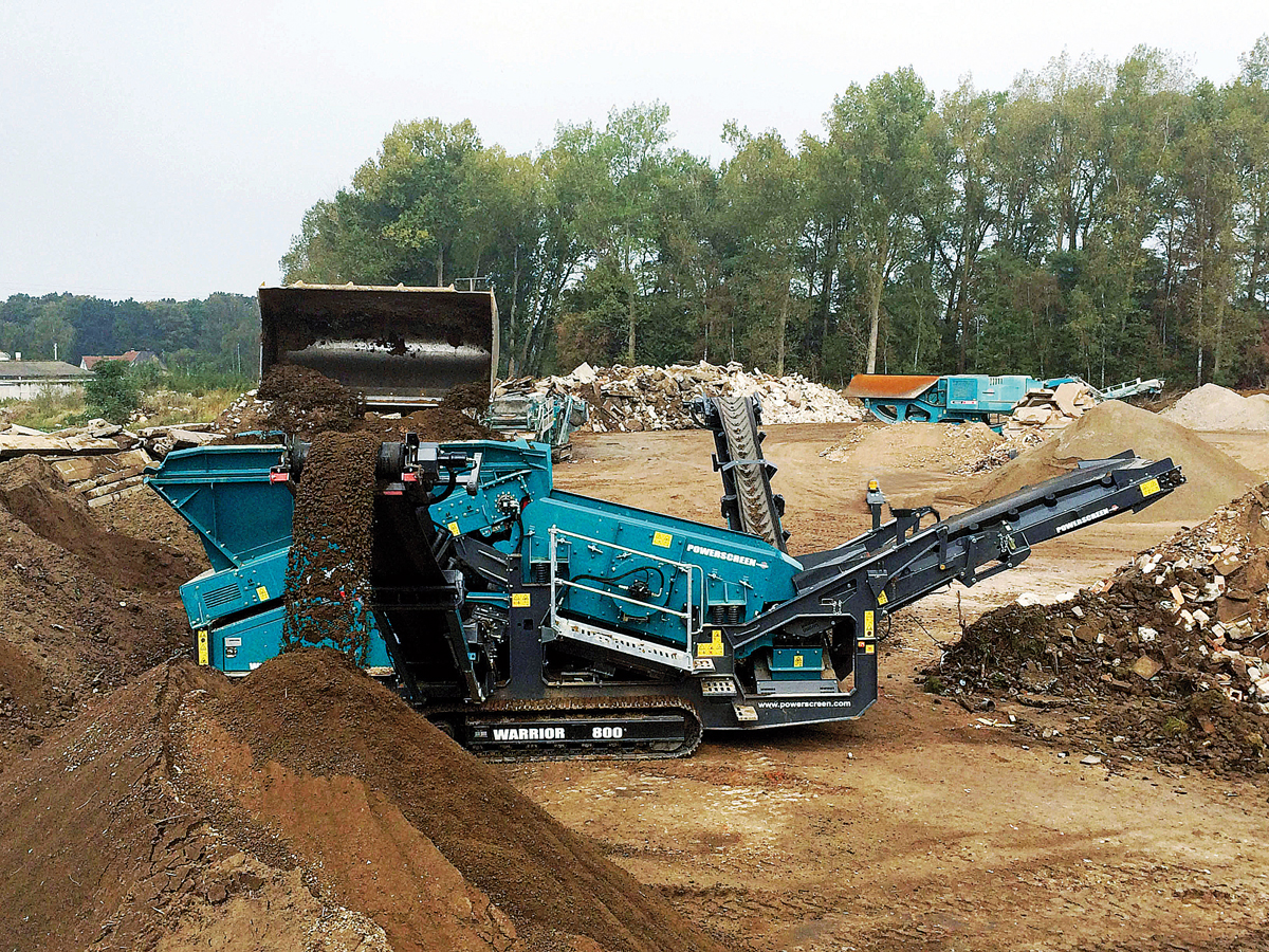 Mit einer Aufgabeleistung von bis ca. 280 t/h gilt Powerscreens Schwerlastsiebanlage Warrior 800 als maßgeschneidert für Unternehmen, die höchsten Durchsatz bei äußerst kompakter Baugröße fordern. Der 3 m³ fassende Aufgabetrichter ist zweiseitig erhöht. Die Siebmaschine selbst misst 2 770 mm x 1 220 mm. Drei hydraulisch klappbare Austragsbänder ermöglichen Abwurfhöhen von 3,64 m/3,82 m (Seitenbänder) bzw. 3,03 m (Endband). Als Antriebsquelle verbaut ist ein Cat-EU-Stufe-V-Dieselmotor mit einer Leistung von 55 kW. Für exzellente Zugänglichkeit und Sicherheit bei Wartung und Service sorgen Laufstege auf beiden Seiten der Anlage, ihr Gesamtgewicht beträgt 18,5 t.