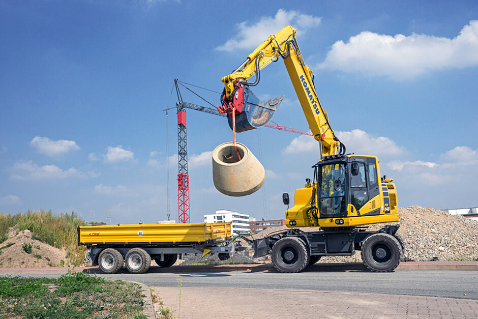 Um seine Einsatzflexibilität zu erhöhen, ist der PW148-11 auch mit einer Anhängerkupplung erhältlich. Damit kann er Anhänger mit Auflaufbremse und einem Gewicht von bis zu 7,5 t ziehen. Die dafür notwendigen elektrischen und hydraulischen Anschlüsse sind ab Werk vorgesehen, inklusive zweier Zusatzkreisläufe zum Kippen des Anhängers oder die Betätigung der Heckklappe. Somit kann der Mobilbagger auf der Baustelle Baumaterialien selbst und flexibel transportieren. Ebenso ist der Transport zusätzlicher Anbaugeräte wie Löffel, Hydraulikhammer und Schalengreifer mit dem Anhänger möglich. Das spart Zeit und hilft, den Bauauftrag schnell auszuführen.