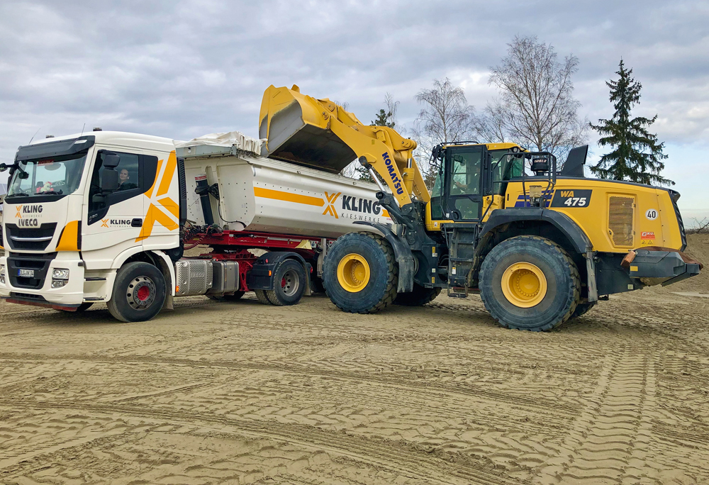 Seit fast 40 Jahren arbeitet die Kling-Gruppe nach dem Motto: »Innovativ, flexibel und schlagkräftig – und immer den Kunden im Blick«. Dabei wird stets im Auge behalten, dass die Natur und deren Ressourcen die Grundlage des Handelns im Unternehmen sind. Nicht nur Maschinen und Fuhrpark sind auf dem neuesten Stand der Technik, auch die Aufbereitungstechnik. So hat Kling zum Beispiel bei den Siebmaschinen die Stahlfederung durch moderne Luftfederung getauscht, um Mensch und Umwelt zu schützen. Im Kling-Kieswerk sind die Mitarbeiter mit bis zu sieben Radladern im Einsatz, um die Produktion von bis zu 600 000 t pro Jahr sicherzustellen. Die beiden neuen Komatsu WA475 sind dafür zuständig, Kies zu laden, aufzuhalten und umzulagern. Bis zu 2 200 Stunden im Jahr werden die Radlader in Betrieb sein.