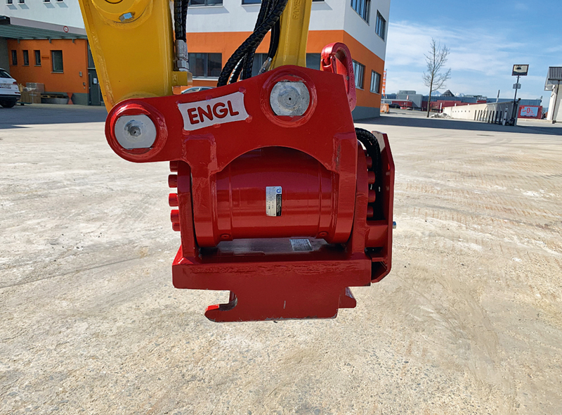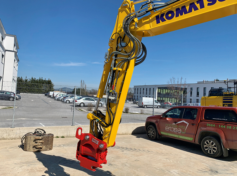 »Bagger werden heute nicht mehr so oft in ihrer herkömmlichen Ausführung verkauft. Viele Kunden bringen individuelle Wünsche ein, die wir natürlich umsetzen wollen«, sagt Kuhn-Verkäufer Leo Resch. So wurden etwa beim PC88MR-11 für die Andreas Fritz Erdbau einige Modifikationen getätigt, die dem Fahrer des Baggers ein ›Lächeln ins Gesicht zaubern‹ sollen. So ist der Kompaktbagger mit einer Gummikette geliefert worden, die viel Laufruhe mit sich bringt und auch den Asphalt nicht beschädigt, wenn auf der Straße gefahren wird. »Die Wendigkeit des Baggers war auch ein Grund für uns, dieses Gerät zu kaufen. Unser Fahrer sitzt jährlich rund 1 500 Stunden am Gerät und es war daher wichtig, die Arbeitsbedingungen für ihn so angenehm wie möglich zu gestalten«, erklärt Andreas Fritz. Helmut Schwarzenberger und Bernhard Mühlfellner in der Kuhn-Werkstatt der Firmenhauptniederlassung in Eugendorf haben daher noch einige Anpassungen vorgenommen: Anstatt eines herkömmlichen Schraubkupplers wurde ein Multikuppler aufgebaut, zusätzlich wurde eine Zentralschmieranlage integriert. Gemeinsam mit der Firma Engl wurde eine Powertilt-Sonderlösung mit niedriger Bauhöhe erarbeitet. Bei Arbeiten mit dem Hydraulikhammer ermöglicht die Powertilt-Funktion das Kippen des Werkzeugs, sodass auch seitlich und präzise gestemmt werden kann, ohne dass der Bagger ständig umpositioniert werden muss. Weiters wurden die Hammer- und Greiferleitungen des Baggers auf je eine Seite verlegt, die Seitenkamera wurde umgebaut, eine Horizontalfederung für den Fahrersitz sowie ein kleiner Kühlschrank für Getränke wurden installiert.