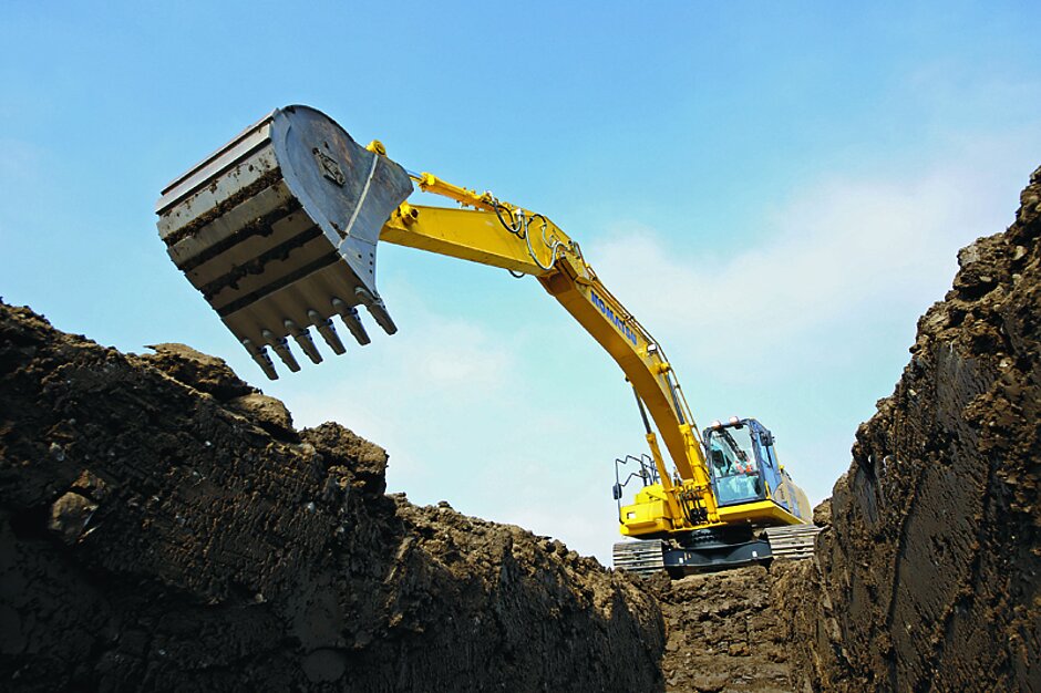 Mit der intelligenten Komatsu-Maschinensteuerung wird ein zu tiefes Eindringen des Löffels über das Zielprofil hinaus verhindert, indem die Löffelkante in Echtzeit in Relation zur Maschinenposition und den Geländeplandaten gesteuert wird. Die Position der Löffelkante wird dem Fahrer in Echtzeit auf dem 12,1"-Farbmonitor angezeigt – ein Pluspunkt gegenüber üblichen Sensorsystemen mit verzögerter Darstellung.