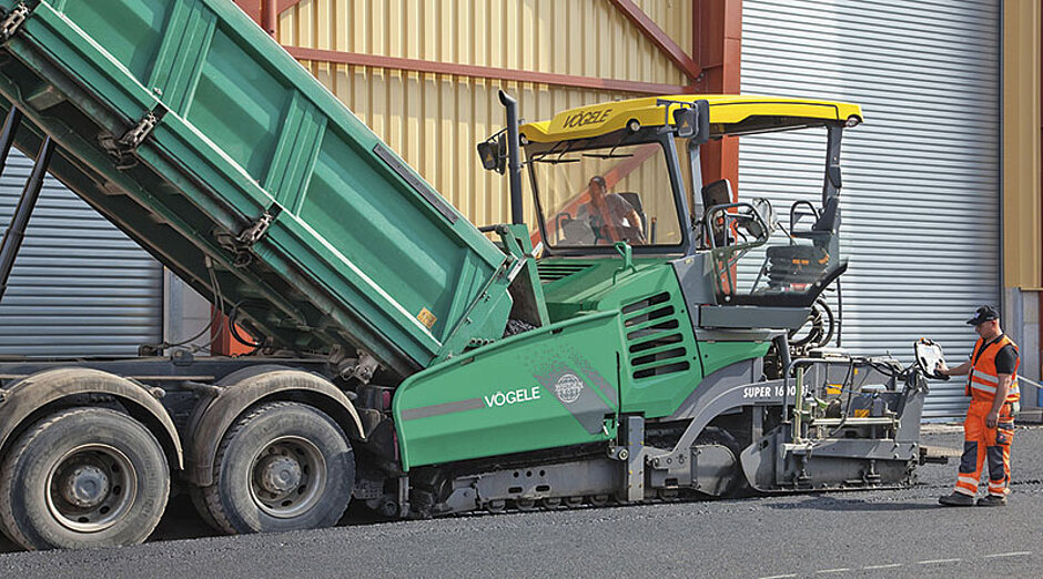 Eine konstante Materialbeschickung ist die Voraussetzung für einen qualitativ hochwertigen und ebenen Einbau. Deshalb hat Vögele für die »Strich 3«-Fertigergeneration den PaveDock-Assistant entwickelt – ein effizientes System, das die Kommunikation zwischen Fertiger- und Lkw-Fahrer erleichtert und eine besonders sichere und stoßfreie Übergabe des Mischgutes unterstützt.