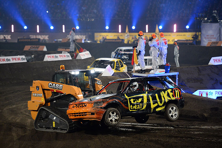 Zehntausende von Zuschauern in der Arena und rund 1,8 Mio. Zuschauer an den Fernsehgeräten verfolgten, wie insgesamt 30 Wettbewerber aus der Medienlandschaft an den Start gingen und um die Trophäen kämpften. Bei der Jubiläumsveranstaltung unterstützte Case Construction Equipment zusammen mit der Schwestermarke Case IH wie in den letzten Jahren das größte Stock-Car-Rennen Europas mit Maschinen und Fahrern. Für die Sicherung der Rennstrecke und den Abtransport der nicht mehr fahrbereiten Stock-Cars hatte Case drei Raupen-Kompaktlader bereitgestellt. Das Case-Fahrer-Team sorgte auch diesmal dafür, dass die »Verschrottungsorgie« trotz äußerst ehrgeiziger Wettbewerber und schonungslosem Materialeinsatz sicher und geordnet ablief.
