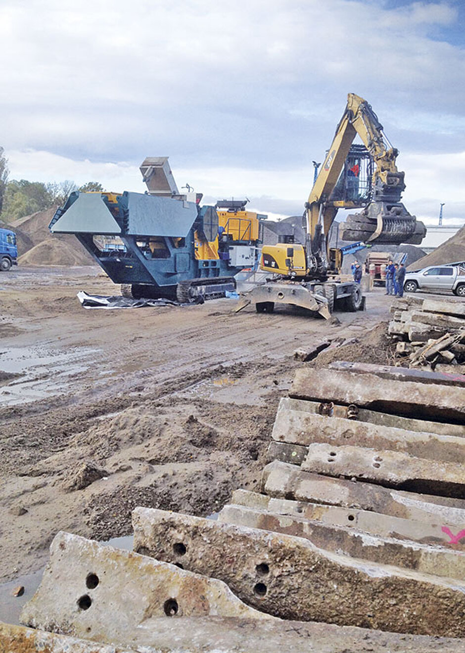 Die Spezialgebiete der raupenmobilen Backenbrecher-Anlage STE 108.75 TV sind die Aufbereitung von Bahnschwellen und allgemein der Betonbruch. Den Technikern des Unternehmens ist es gelungen, für diese Aufgaben eine neue Lösung mit hydraulischer Spaltverstellung zu entwickeln, die gegenüber herkömmlichen Systemen eine deutliche Verbesserung verspricht. Herzstück der neuen Anlage ist der Backenbrecher STE 108.75 ASV mit einer Aufgabeöffnung von 1 080 x 750 mm und Spaltweiten von 50 bis 200 mm, eine wichtige Rolle. Der elektrische, 132 kW starke Antrieb ermöglicht eine eindrucksvolle Produktionsleistung im Betonbruch bis ca. 300 t/h oder beim Brechen von Bahnschwellen bis zu 200 Schwellen/h. Entscheidend ist die Ermittlung der wirkenden Kräfte direkt an der Brechbacke. Überschreitet die gemessene Brechkraft den voreingestellten Grenzwert, wird der Brechspalt automatisch geöffnet. Das »unbrechbare« Teil kann den Brecher gefahrlos verlassen. Anschließend begibt sich die bewegliche Brechbacke wieder in die vordefinierte Grundstellung. Der Brechprozess kann ohne weitere Verzögerung fortgesetzt werden. Dank des dieselelektrischen Antriebs und eines schallisolierten Aggregats punktet die STE 108.75 TV zudem mit niedrigen Emissionswerten. Zusätzlich ermöglicht die Option »Netzgeneratorumschaltung« niedrige Energiekosten bei gleichzeitig geringer Lärm- und Schadstoffbelastung.
