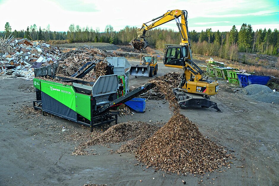 Mit dem Sternsieb Multistar One lässt sich nach Einschätzung von Komptech Biomasse- und Altholzaufbereitung am effektivsten lösen. Die Zerkleinerungsarbeit erledigt ein der Multistar One vorgeschalteter Crambo. Das Abtrennen einer definierten Nutzfraktion bei gleichzeitiger Rückführung der Überlängen in den Zerkleinerer ist dann die Aufgabe der Multistar One: Ausgerüstet mit einem Aufgabebunker zur exakten Materialübergabe auf das großdimensionierte Siebdeck, einem Abwurfband mit 4 m Abgabehöhe und einem Rückführband mit einem Schwenkradius von 220° meistert die One eine Durchsatzleistung von bis zu 200 m³/h.