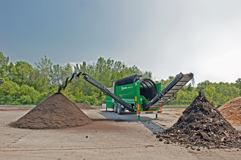 Mit der Nemus 2700 bietet Komptech eine mobile Anlage an, die mit den Anforderungen in der Sand- und Kiesindustrie oder beim Baustoff-Recycling bestens zurecht kommen soll. Die Siebmaschine verfügt über ein robustes Fahrwerk mit einem verwindungssteifen Rahmen, der mit massiven hydraulischen Stützfüßen aufwartet. Der Antrieb des Bunkerbandes liegt an der Trommeleinlaufseite, was einen optimalen Reibschluss unterstützt, indem das Band gezogen und nicht geschoben wird. Zusätzlich verhindert eine Bunkerbandsteuerung ein Schieflaufen des Bandes.