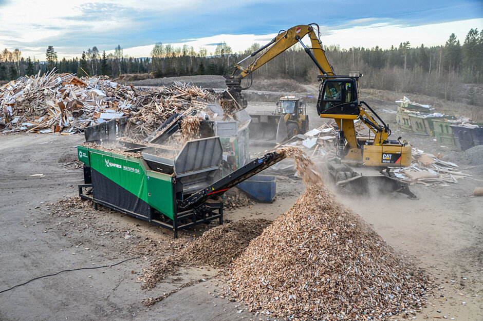 Mit dem neuen Sternsieb Multistar One lassen sich Altholz und Biomasse effektiv aufbereiten. Die Zerkleinerungsarbeit erledigt ein der Multistar One vorgeschalteter Crambo oder Terminator. Das Abtrennen einer definierten Nutzfraktion bei gleichzeitiger Rückführung der Überlängen in den Zerkleinerer ist dann die Aufgabe der One: Ausgerüstet mit einem Aufgabebunker zur exakten Materialübergabe auf das groß dimensionierte Siebdeck, einem Abwurfband mit 4 m Abgabehöhe und einem Rückführband (220° Schwenkradius) meistert die One eine Durchsatzleistung von bis zu 200 m³/h.