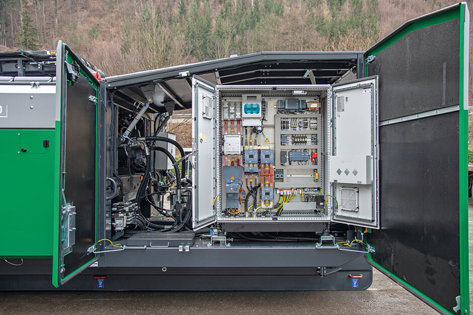Unterschiedlich sind die Komponenten im Inneren des Motorraums gestaltet – neben dem Elektromotor ist das vor allem der gekapselte Schaltschrank der Schutzklasse IP54, der mit jeder Staubbelastung, aber auch mit hohen Außentemperaturen problemlos zurechtkommen soll. Die Energieversorgung erfolgt durch das lokale Stromnetz, wobei das An- und Abstecken durch ein System mit Auftrennung des Anschlusskabels in einzelne Phasenkabel praktikabel ist. Zusätzlich verfügt die Maschine standardmäßig über einen elektronischen Hauptschalter.