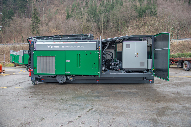 »e-mobile« steht bei Komptech für die semimobile, elektrische Ausführung der bekannten langsamlaufenden Terminator- und Crambo-Zerkleinerer von Komptech. Dabei wird das Hydrauliksystem statt durch einen Dieselmotor von einem Elektromotor angetrieben. Für die Elektromotoren wurde die im Stationärbereich bewährte Abstufung übernommen: 160 kW stehen dabei für die Leistungsstufe 3 400 und 200 kW für die Variante 5 000 bereit. Die Verkleidung und die Zugänglichkeit des Motorraums sind nahezu identisch mit den dieselbetriebenen Varianten.