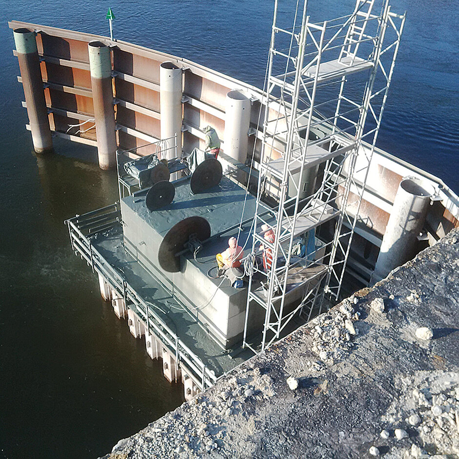 Die horizontalen Schnitte wurden mit dem Tyrolit-Diamantseil DWL***-CF (25 m lang) durchgeführt. In Kombination mit der Tyrolit-Hydrostress SK-SD-Seilsäge und den Hydraulikaggregaten BR-3 und ADS-4 konnten bis zu 2 m²/h armierter Beton geschnitten werden. Voraussetzung für den effizienten Rückbau war ein konstanter, horizontaler Schnitt, sodass das 2 000 mm große Wandsägeblatt die 90 cm starken Betonlagen anschließend durch vertikale Schnitte komplett trennen konnte.
