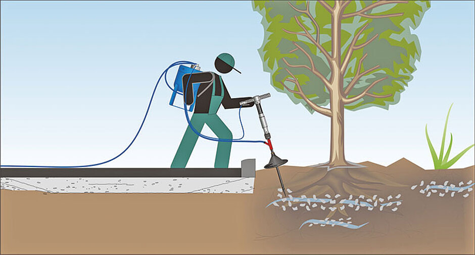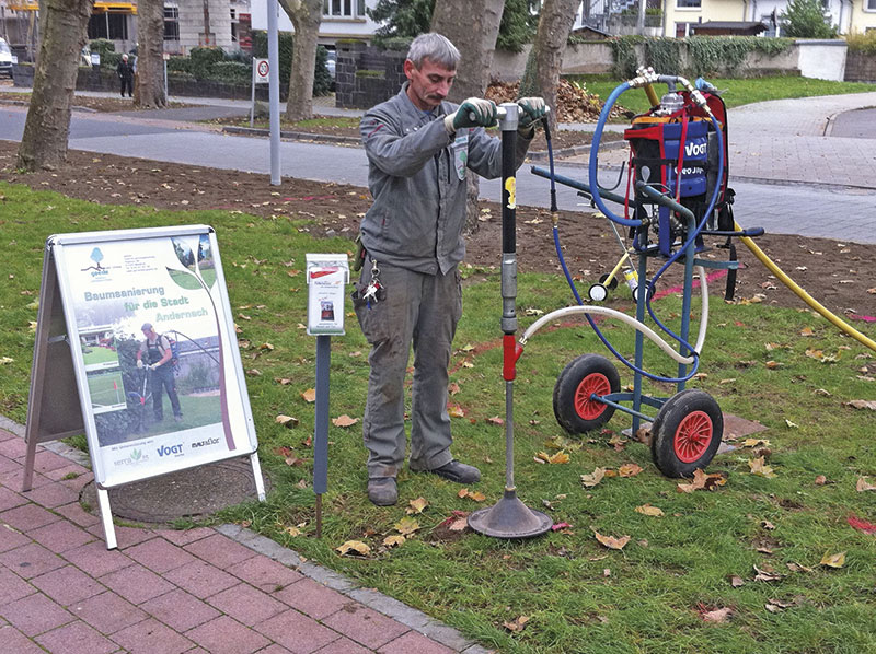 Für die Einbringung der Hilfsstoffe setzen Terra-Fit-Partner druckluftbetriebene Geo-Injektoren von Vogt (ebenfalls aus Pfaffendorf) ein. Dabei wird ein Injektionsspieß in den Boden eingeführt und in den notwendigen Tiefen eine Untermischung im Vorlockerungs- und Einblasverfahren veranlasst. Steuerbar ist neben dem Tiefenschema, das beispielsweise einen tiefgreifenden Baum versorgt, die flach wurzelnde Grasnarbe hingegen auslassen kann, steuerbar ist aber auch die Ausbringrichtung. Gerade im Anschlussbereich an Straße oder Pflaster muss der Bereich der Bodenaufwertung vom Bereich des Straßenunterbaus getrennt werden, will man Hebungsschäden durch Wurzelwachstum vermeiden.