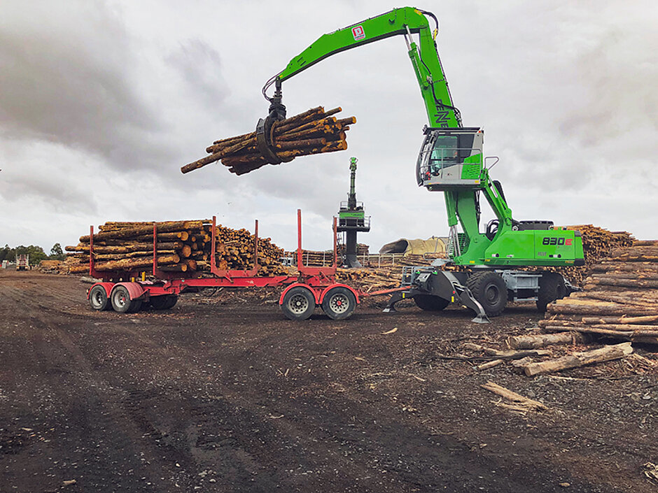„Dank des stabilen, allrad-betriebenen Unterwagens und den passenden Luftreifen gelingt das Fahren auf den teilweise unbefestigten, unebenen Oberflächen unseres Platzes mühelos! Mit dem 830 E von SENNEBOGEN haben wir die perfekte Lösung gefunden, um das feuchte Holz schnell, umweltschonend und effizient zu transportieren“, meint Vernon Locke, Manager des Standorts in Maryvale, Australien.