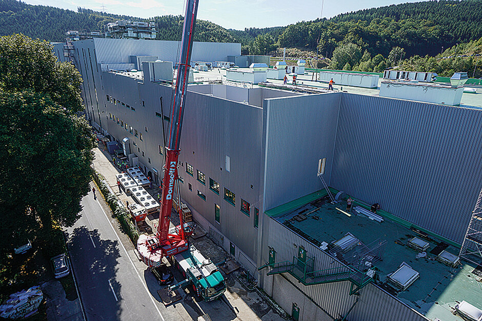 Die Störkante, in diesem Fall die Gebäudehöhe, lag bei 22,5 m. Die Endposition, in die die Aggregate gehoben werden mussten, war 57 m von der Drehkranzmitte des Krans entfernt. Die Herausforderung bestand darin, bei zwingend minimaler Hauptauslegervorneigung und mithilfe einer neuen hydraulisch bis 50° abwinkelbaren Spitzenverlängerung von Grove die Montageposition im entsprechenden Arbeitsradius zu erreichen. »Bei solchen Raumverhältnissen setzen wir normalerweise mobile Faltkrane ein, allerdings können diese bisweilen nicht die geforderte Traglast bieten«, erläuterte Michel Jaeger, technischer Außendienstmitarbeiter bei Dornseiff. »Unser neuer Grove GMK5250L mit der bis zu 37,3 m langen, abwinkelbaren Spitzenverlängerung macht damit sogar viele logistisch aufwendige Wippspitzeneinsätze noch größerer Krane überflüssig. So hilft er uns dabei, unser Angebotsspektrum noch weiter kundenorientiert auszubauen.«