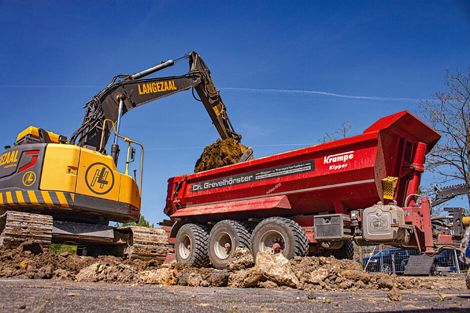Eine gehobene Fahrzeugausstattung erleichtert den Fahrern die Arbeit. Neben einer hydraulischen Zwangslenkung, einer Fett-Zentralschmieranlage und einer eigenen Ölversorgung mit Schnellabsenkung verfügt die Tridem Halfpipe HP 30 über ein Fahrwerk mit Luftfederung. Mit den 360 mm großen Luftfederbälgen verspricht der HP 30 ein ruhiges, komfortables Fahrverhalten auf jeder Baustelle. Gekröpfte Zweiblattlenker sorgen für einen niedrigen Schwerpunkt. Beim Kippvorgang werden die Luftfederbälge entlüftet, sodass sich das Gewicht des Anhängers automatisch auf die Hinterachse absenkt und gleichermaßen die Stand- und Arbeitssicherheit profitieren. »Wir haben bereits eine Krampe-Tandem-Halfpipe HP 20, mit der wir sehr zufrieden sind«, sagt Christoph Grevelhörster, Geschäftsführer des Baggerbetriebs. »Die neue Erdbaumulde ist dank ihres Abgleitwinkels ideal für klebrige Ladegüter wie auch für Bauschutt geeignet. Die Fahrer schätzen die praktischen Sonderausstattungen und die Robustheit der Halfpipe HP 30. Große Freude bereitet ihnen das luftgefederte Fahrwerk, eliminiert es doch in schwerem Gelände Schwingungen und Erschütterungen, die nun von der Zugmaschine ferngehalten werden.« t