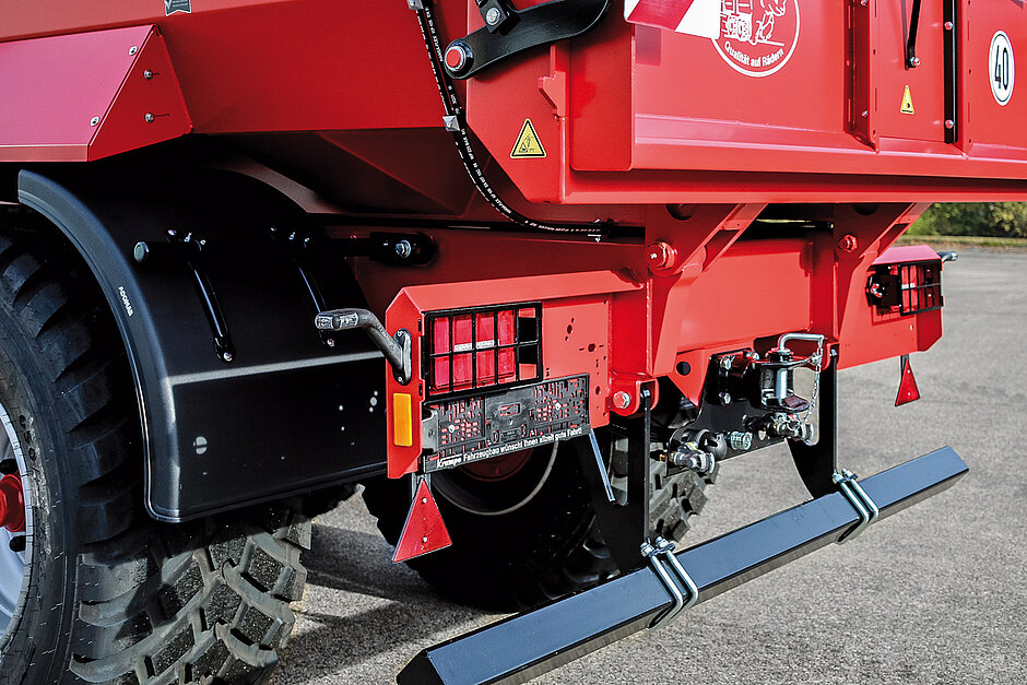 In der Praxis stellt der Unterfahrschutz oft ein Problem dar. Dort wo Materialien oft auf Überladebänder oder in Schüttbunker entladen werden, braucht es einen möglichst großen, hohen Überhang des Fahrzeughecks, der in die Annahmen ragt. Auch beim Heranfahren an Halden ist ein herkömmlicher Unterfahrschutz oft hinderlich. Krampe hat nun einen hydraulisch hochschwenkbaren Unterfahrschutz entwickelt, der fast gänzlich nach oben verschwindet, was eine Besonderheit ist. Da bei dem neuen Unterfahrschutz auch die Rückleuchten integriert sind, schwenken diese ebenfalls mit hoch und wandern so aus dem Gefahrenbereich heraus. Der Fahrer muss bei dieser technischen Lösung nicht mehr absteigen, sondern kann von der Kabine aus den Unterfahrschutz hochschwenken. Das entlastet den Fahrer und hilft Unfälle zu vermeiden. Die unterschiedlichen Bauarten – starr, klappbar und hydraulisch hochschwenkbar – bieten laut Krampe »für jede Kundenanforderung eine passende Lösung« und sind nach aktuellen europäischen Verordnungen genehmigt. Klargestellt hat Krampe zudem, dass der Unterfahrschutz selbst hergestellt wird. Für die Zulassung wurden ausführliche Belastungstests am firmeneigenen Prüfstand und in Zusammenarbeit mit der technischen Prüforganisation GTÜ durchgeführt. Ende 2021 erhielt Krampe den Gebrauchsmusterschutz dafür. Der modulare Unterfahrschutz wird im Rahmen der EU-Typengenehmigung nun bei fast allen Fahrzeugen eingesetzt.d