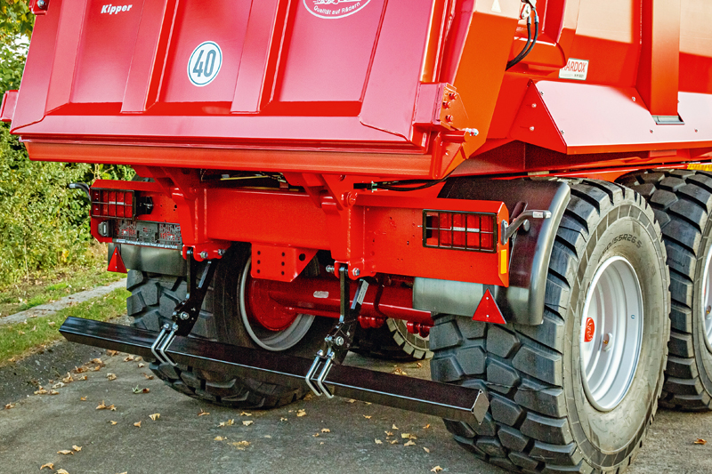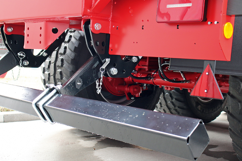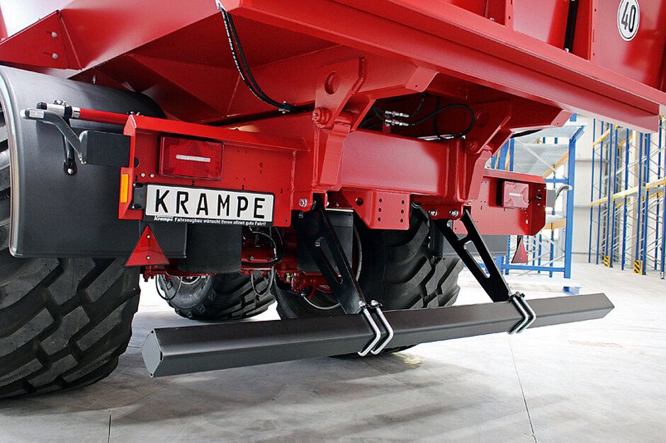 Der Unterfahrschutz im Fahrzeugheck besteht aus einem Querprofil, das mit Stützen am Fahrzeugrahmen befestigt ist und die Kräfte bei einem Auffahrunfall aufnehmen kann. EU-Richtlinien geben den Abstand des Profils zum Boden und zum Fahrzeugheck vor, ebenso sind die Druckkräfte definiert, die der Unterfahrschutz bei Verkehrsunfällen im Falle einer Kollision absorbieren muss. Um auch bei unterschiedlichen Rädergrößen und Achsaggregaten immer den Richtlinien zu entsprechen, wird die Höhe der Stützen bei Krampe an das jeweilige Fahrzeug angepasst. Zudem ändern sich die Anforderungen an den Unterfahrschutz in der Praxis je nach Einsatzgebiet: So ist es bei Baustellenfahrzeugen oft vorteilhaft, dass der Unterfahrschutz hochgeklappt werden kann. Anwender wissen zu schätzen, dass sie dadurch beim Fahren im schweren Gelände mehr Bodenfreiheit haben und beim Rückwärtskippen dichter an den bestehenden Haufen heranfahren können.