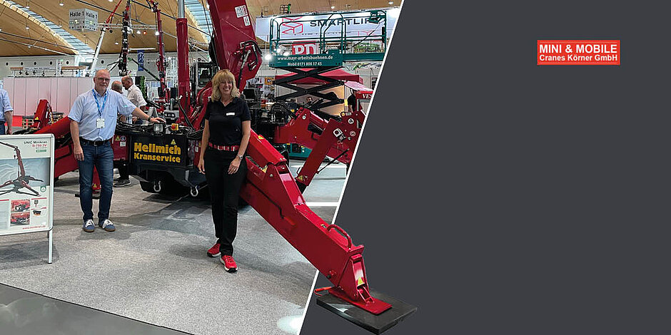Für das Messeteam von Mini & Mobile Cranes Körner und Baumo Kranservice war die Veranstaltung gleich in mehrfacher Hinsicht ein Erfolg: Nicht nur stießen unter anderem die Unic Minikrane mit Traglasten bis 10 t sowie die 16 m Sunward Gelenkteleskopbühne und 8 m Scherenarbeitsbühne auf großes Interesse. Ein weiteres Highlight war der Mini Mobilkran Kato CR-130Rf mit 13 t Traglast bei einer Fahrzeugbreite von nur 1,99 m, Fahrzeughöhe von 2,85 m und einem Eigengewicht von 13,8 t. Zudem übergab Geschäftsführerin Dietlind Overhoff zwei Unic-Krane B-350.2V und B-780.3TV an die Firma Hellmich. s