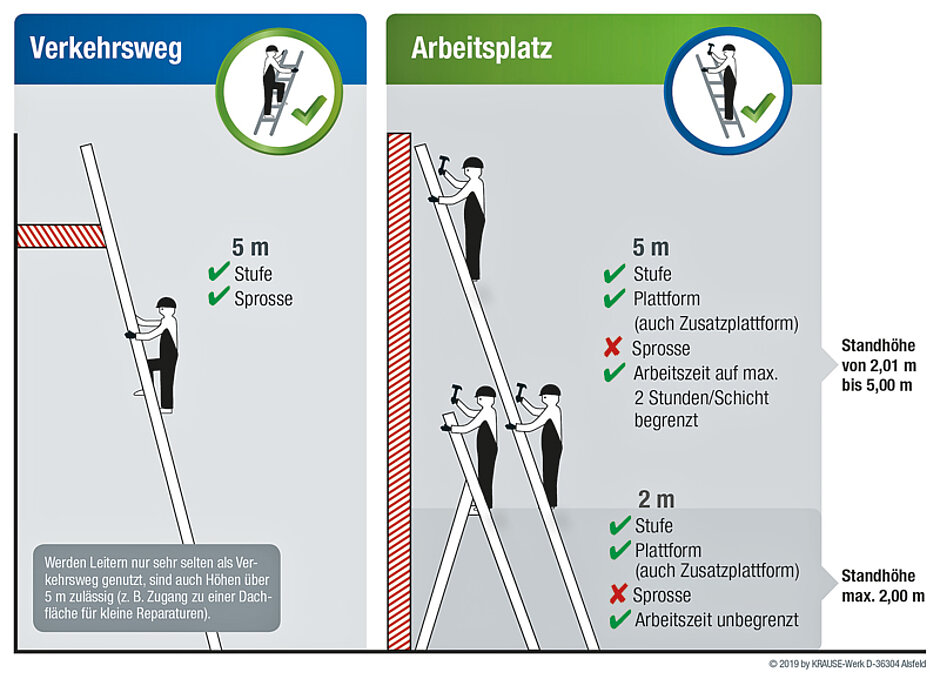 Eine Nutzung der Leiter als Verkehrsweg liegt vor, wenn ein höher- oder tieferliegender Arbeitsplatz mithilfe der Leiter erreicht werden soll und die Leiter dabei verlassen wird. Im Gegensatz dazu liegt eine Nutzung als Arbeitsplatz vor, wenn der Nutzer während der Tätigkeit die Leiter nicht verlässt. Die Verwendung einer Leiter als Verkehrsweg ist bis zu einer maximalen Höhe von 5 m möglich. Werden Leitern nur selten als Verkehrsweg benutzt, sind auch Höhen über 5 m zulässig. Bei der Verwendung einer Leiter als Arbeitsplatz sind nach den Regeländerungen nur noch Stufenleitern erlaubt.