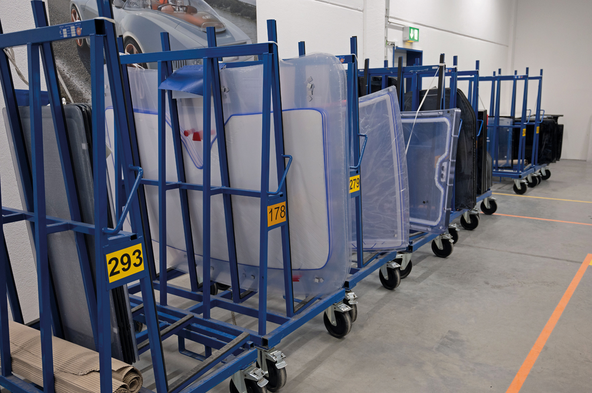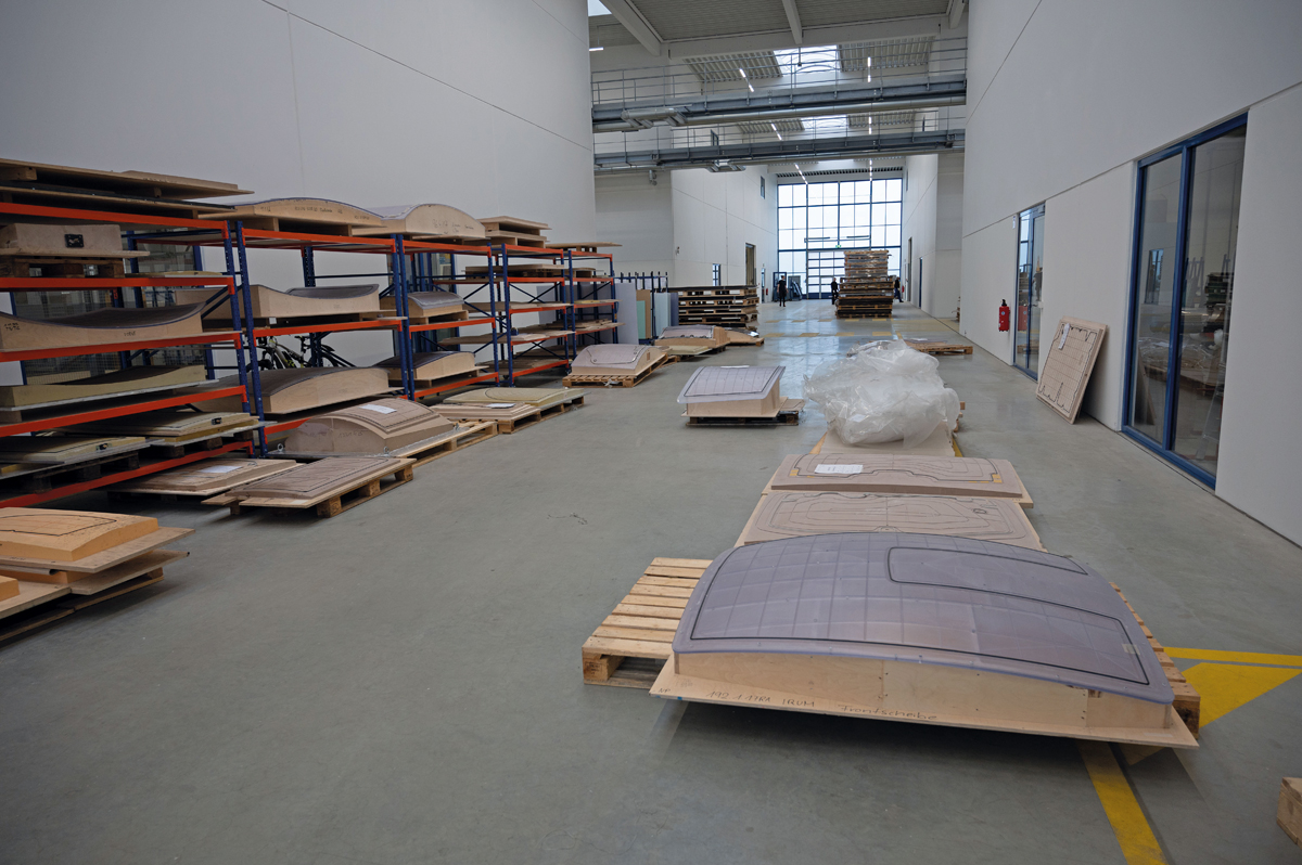 Jedes Jahr werden etwa 3 500 t Polycarbonat verarbeitet. Lanio dazu: »Wir erwerben die unbeschichteten PC-Platten im Standardmaß 3 x 2 m oder im speziellen Zuschnitt, damit wir selber nicht so viel schneiden müssen und weniger Verschnitt haben. Anschließend geht es weiter mit dem Laminieren, Beschichten, Umformen, CNC-Fräsen sowie der Entwicklung bzw. Anwendung des passenden Lacks für die Beschichtung sowie Klebers. Unser großer Vorteil ist, dass dies alles bei uns im Haus passiert: Wir verfügen in Geesthacht über acht Öfen, wo das Material erwärmt und umformt wird. In Bardowick werden die Verbünde anschließend in einem großen Reinraum zusammengelegt und dann im Autoklav unter Druck sowie Hitze gebacken. Dann kommen sie in die europaweit modernste Beschichtungsanlage mit zwei dreidimensionalen Beschichtungsrobotern. Das gibt uns eine enorme Unabhängigkeit sowie Flexibilität in der Produktion.«