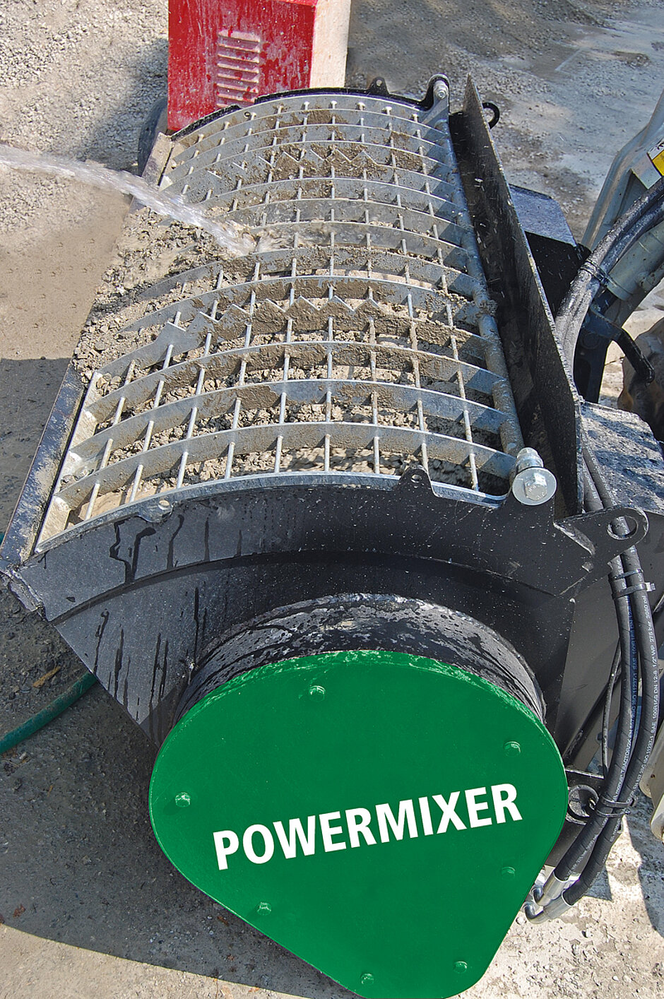 Powermixer für Radlader oder Bagger sind in Größen von 100 l bis 2 000 l Beton verfügbar. Das Anbaugerät wird an die Bordhydraulik des Trägergeräts angeschlossen und über diese betrieben. Sowohl der Motor der Mischerschnecke als auch der Hydraulikzylinder, mit dem die Bodenöffnung geöffnet und verschlossen wird, werden hydraulisch angetrieben bzw. betätigt.