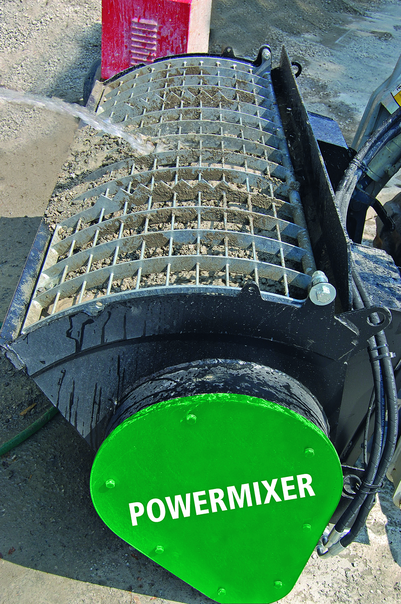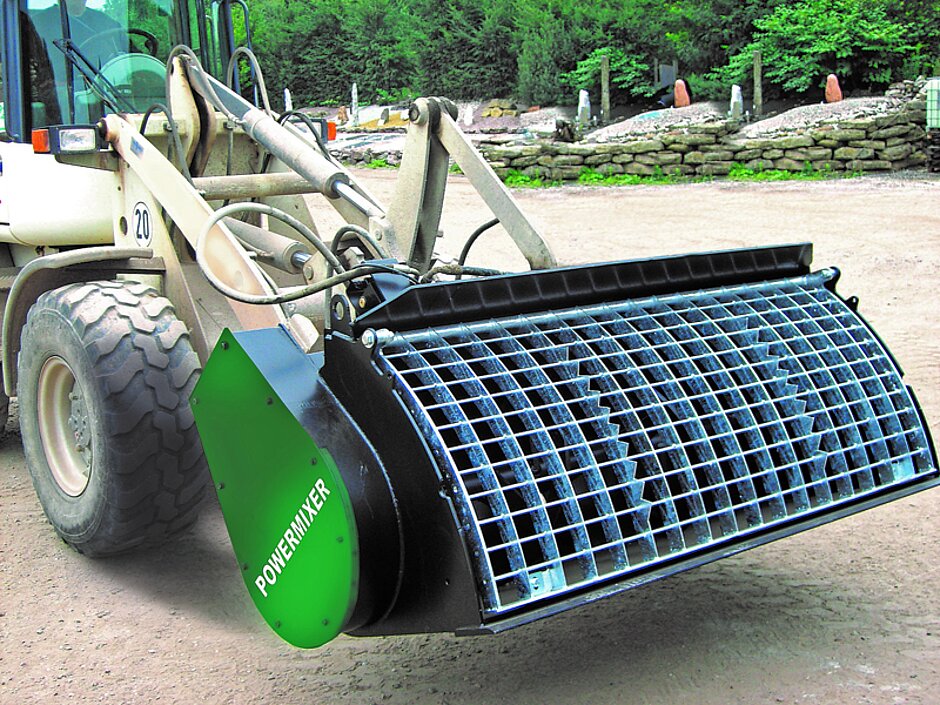 Kronenberger hat den Powermixer mit allem ausgestattet, was für den Anbau erforderlich ist. Die Bodenöffnung in der Mitte der Schaufel, durch die der Beton zielgenau abgelassen werden kann, wird hydraulisch geöffnet und geschlossen, damit der Fahrer seinen Fahrerstand beim Öffnen und Schließen der Bodenöffnung nicht verlassen muss. Beladen wird der Powermixer wie eine normale Schaufel und durch ein speziell dafür ausgelegtes geschlossene Gitter.