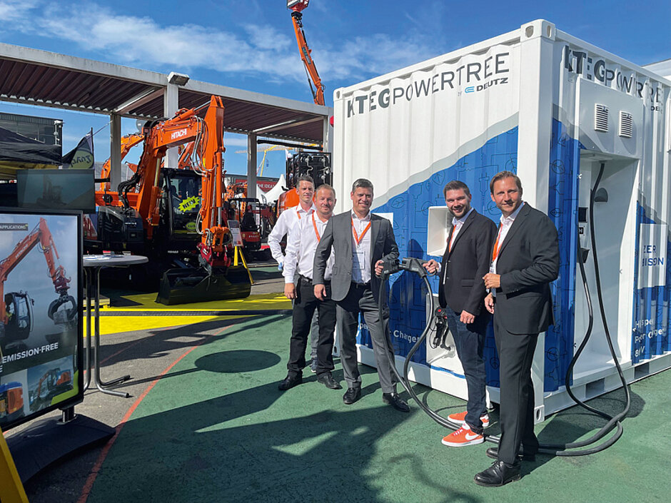 Antriebssystemanbieter Deutz arbeitet daran, Elektromobilität einer noch breiteren Masse zugänglich zu machen. KTEG sieht sich als einer der führenden Innovatoren für Schlüsselmaschinen und -technologien rund um die Baustelle. Im Geschäftsfeld ZECOM (Zero Emission Construction Machinery) entwickelt und baut das Unternehmen elektrisch betriebene Kompaktbagger. Mit »Powertree« stellen die beiden Unternehmen ein Gemeinschaftsprojekt vor, das die Anforderungen der Baustelle erfüllt und mithilfe des CCS2-Standards verschiedenste batterieelektrisch betriebene Baumaschinen und -fahrzeuge in kürzester Zeit lädt. Im Gewand eines ortsflexiblen 10'-Containers kombiniert der Powertree ein 800-V-System samt 125 kWh starker und individuell skalierbarer Pufferbatterie mit einer Schnellladesäule für den Baustelleneinsatz.