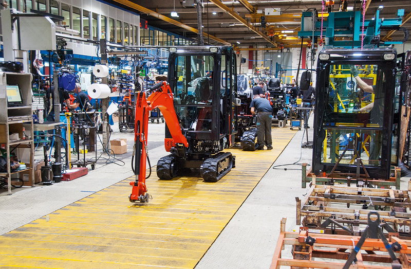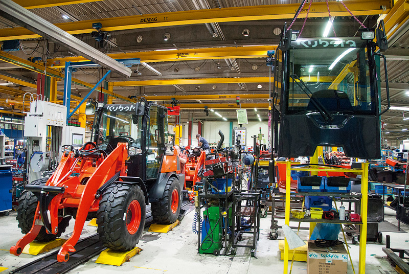 Bidell: Das Werk in Zweibrücken ist das zweitgrößte in der Kubota-Organisation, deren Gesamtproduktionskapazität knapp 50 000 Kompaktbagger pro Jahr beträgt. Insgesamt haben wir drei Baumaschinenwerke: Das Stammwerk Hirakata bei Osaka mit einer Kapazität von 33 900 Einheiten, ein Werk in China (ca. 6 200) und das 1989 gebaute Werk in Zweibrücken, in dem wir, wie schon gesagt, im vergangenen Jahr insgesamt ca. 10 700 Einheiten produziert haben. Der Stellenwert ist für Kubota immens hoch. Denn Deutschland ist in Europa der größte Markt, und Europa ist für uns der größte Absatzmarkt. Und den beliefern wir mit den hier produzierten Baggern im Segment von 0 t bis 3,5 t. Dazu kommen unsere Radlader, die wir hier für die europäischen Märkte und für die in Nordamerika herstellen. Insgesamt haben wir in Zweibrücken seit der Inbetriebnahme des Werks knapp 140 000 Maschinen gebaut.