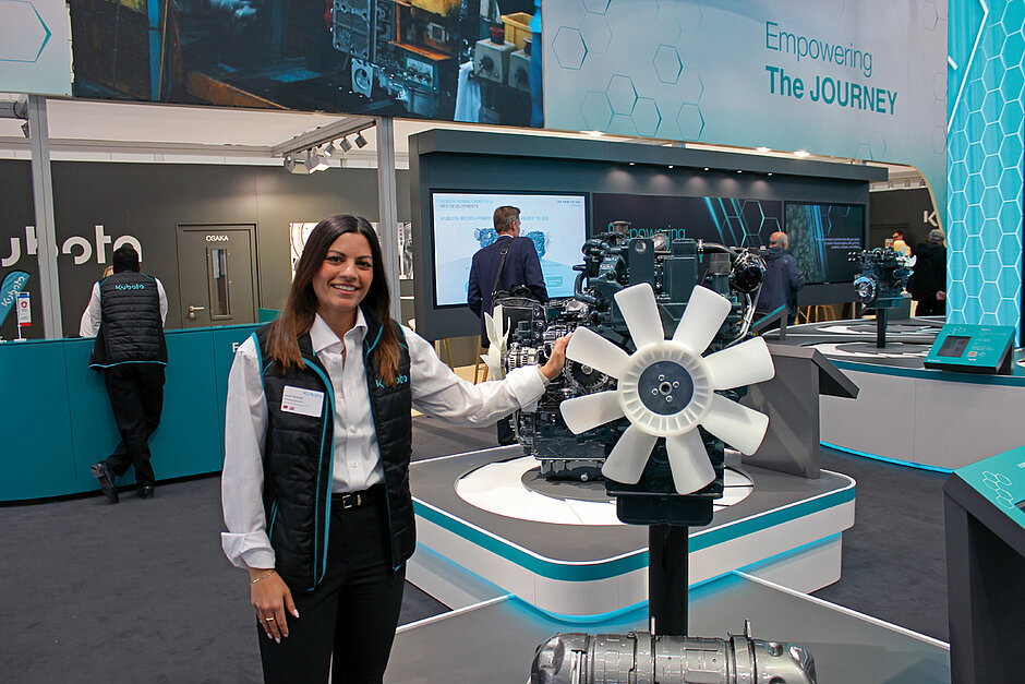 Einer der Höhepunkte bei Kubota war die Präsentation des neuen wasserstoffbetriebenen 3,8-l-Motors mit einer Leistung von 85 kW. Dieser basiert auf dem »WG3800« mit den gleichen Abmessungen und dem gleichen Bauraum. Die Position des Nebenabtriebs für den Wasserstoffmotor ist zudem identisch, sodass ein unkomplizierter und einfacher Wechsel für den Kunden möglich ist. Darüber hinaus entwickeln das japanische Unternehmen Denyo Corporation, einer der größten Generatorenhersteller der Welt, und Kubota einen eigenen, mobilen Generator, der mit einem Wasserstoffmotor von Kubota ausgestattet ist.