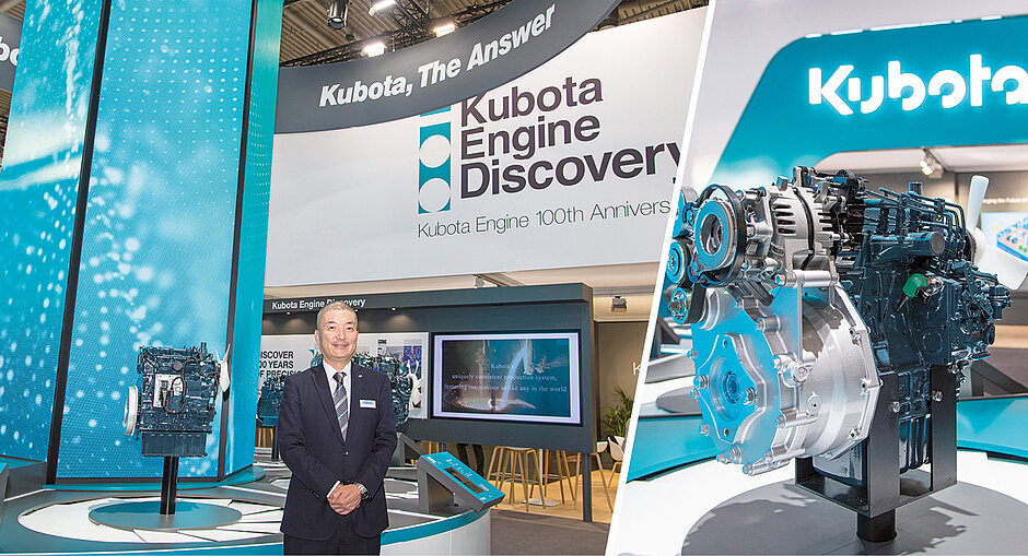 Ein weiterer Aspekt am Stand von Kubota war der Motor WG3800-H2 und damit eine Entwicklung für industrielle Anwendungen, der von der Denyo Co. Ltd. genutzt wird, um einen Wasserstoffgenerator anzutreiben. Im Rahmen einer Initiative des Unternehmens zur Kohlenstoffneutralität erforscht die Kubota Corporation Motoren für Industriemaschinen, die eine hohe Kraftstoffeffizienz aufweisen und durch die Verwendung von Wasserstoff oder auch Bio- und synthetischen Kraftstoffen klimaneutral betrieben werden können.