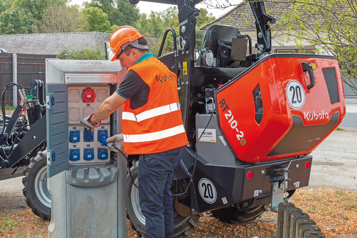 »Wir sind stolz darauf, zwei neue Modelle in unserem Radladerprogramm begrüßen zu dürfen. Der RT210-2e und der RT220-2e sind nach unseren Ketten-Dumpern die zweite Kubota-Maschinenreihe, die wir elektrifizieren«, betont Mathieu Bourson, Produkt-Manager für Kubota Europa. Als Basis für die Entwicklung dienten bei beiden Modellen die entsprechenden Maschinen mit Dieselantrieb. Der konventionelle Motor wurde durch ein elektrisches System ersetzt, das aus zwei Elektromotoren (einem für den Fahrantrieb und einem für die Arbeitsbewegungen) und einem gemeinsamen Batteriespeicher besteht.